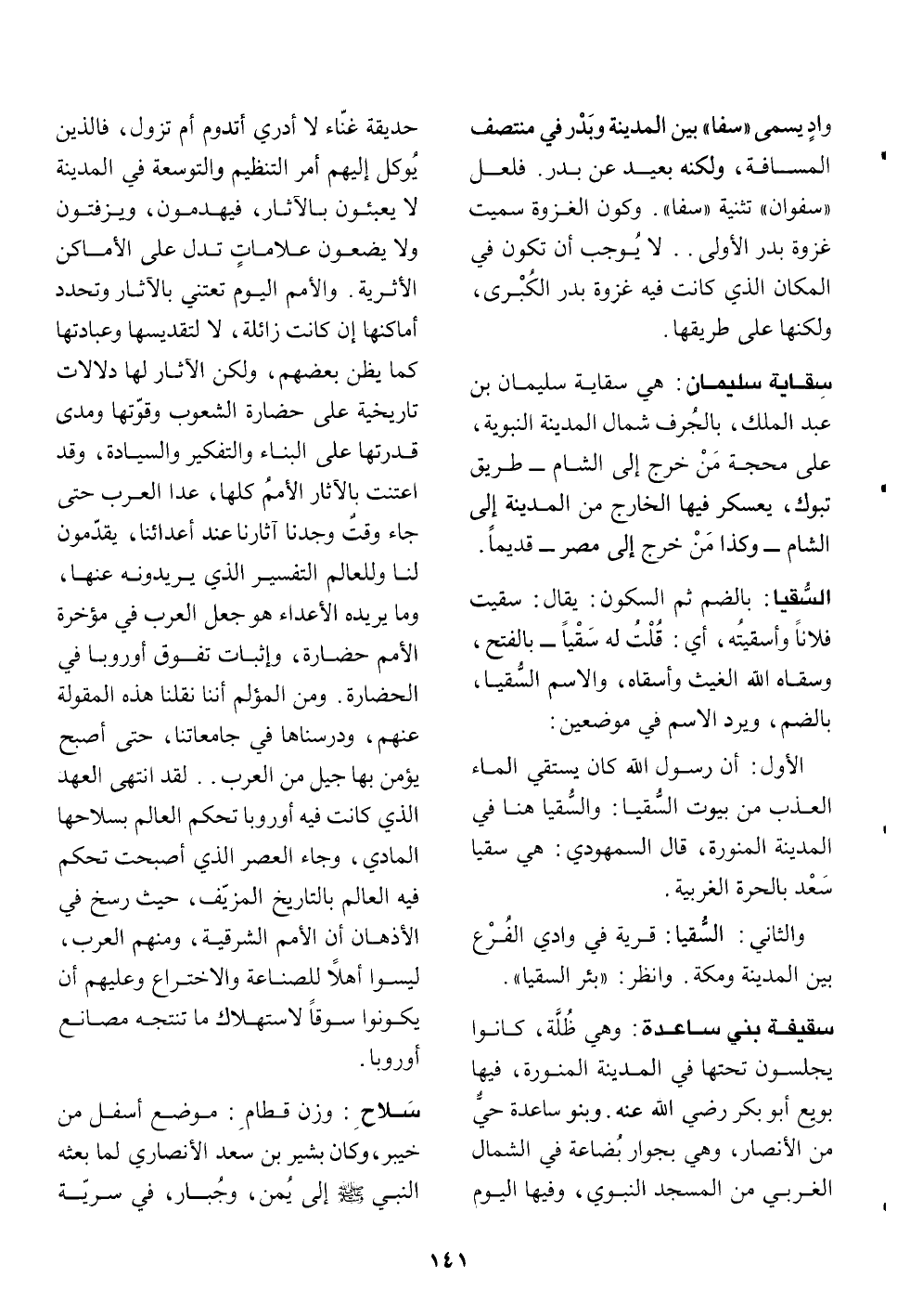 وهي ظلّة، كانوا يجلسون تحتها في المدينة المنورة، فيها بويع أبو بكر رضي الله عنه. وبنو ساعدة حيّ من الأنصار، وهي بجوار بضاعة في الشمال الغربي من المسجد النبوي، وفيها اليوم حديقة غنّاء لا أدري أتدوم أم تزول، فالذين يوكل إليهم أمر التنظيم والتوسعة في المدينة لا يعبئون بالاثار، فيهدمون، ويزفتون ولا يضعون علامات تدل على الأماكن الأثرية. والأمم اليوم تعتني بالاثار وتحدد أماكنها إن كانت زائلة، لا لتقديسها وعبادتها كما يظن بعضهم، ولكن الاثار لها دلالات تاريخية على حضارة الشعوب وقوّتها ومدى قدرتها على البناء والتفكير والسيادة، وقد اعتنت بالاثار الأمم كلها، عدا العرب حتى جاء وقت وجدنا آثارنا عند أعدائنا، يقدّمون لنا وللعالم التفسير الذي يريدونه عنها، وما يريده الأعداء هو جعل العرب في مؤخرة الأمم حضارة، وإثبات تفوق أوروبا في الحضارة. ومن المؤلم أننا نقلنا هذه المقولة عنهم، ودرسناها في جامعاتنا، حتى أصبح يؤمن بها جيل من العرب.. لقد انتهى العهد الذي كانت فيه أوروبا تحكم العالم بسلاحها المادي، وجاء العصر الذي أصبحت تحكم فيه العالم بالتاريخ المزيّف، حيث رسخ في الأذهان أن الأمم الشرقية، ومنهم العرب، ليسوا أهلا للصناعة والاختراع وعليهم أن يكونوا سوقا لاستهلاك ما تنتجه مصانع أوروبا.
