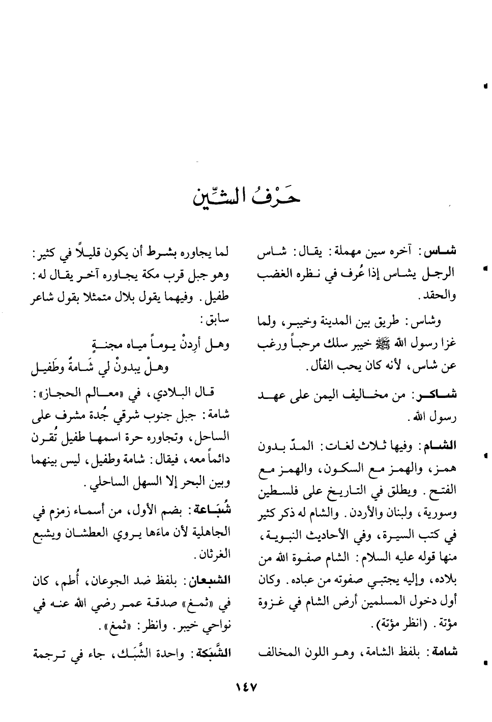 وفيها ثلاث لغات: المدّ بدون همز، والهمز مع السكون، والهمز مع الفتح. ويطلق في التاريخ على فلسطين وسورية، ولبنان والأردن. والشام له ذكر كثير في كتب السيرة، وفي الأحاديث النبوية، منها قوله عليه السلام: الشام صفوة الله من بلاده، وإليه يجتبي صفوته من عباده. وكان أول دخول المسلمين أرض الشام في غزوة مؤتة. (انظر مؤتة) .