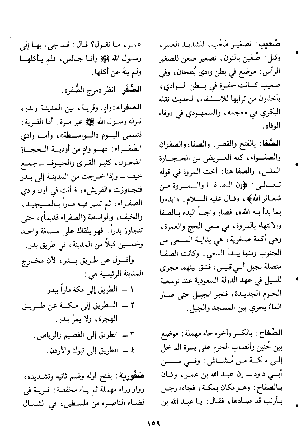 بالفتح والقصر. والصفا، والصفوان والصفواء، كله العريض من الحجارة الملس، والصفا هنا: أخت المروة في قوله تعالى: إِنَّ الصَّفا وَالْمَرْوَةَ مِنْ شَعائِرِ اللَّهِ، وقال عليه السلام: «ابدؤا بما بدأ به الله» ، فصار واجبا البدء بالصفا والانتهاء بالمروة، في سعي الحج والعمرة، وهي أكمة صخرية، هي بداية المسعى من الجنوب ومنها يبدأ السعي. وكانت الصفا متصلة بجبل أبي قبيس، فشق بينهما مجرى للسيل في عهد الدولة السعودية عند توسعة الحرم الجديدة، فنجر الجبل حتى صار الماء يجري بين المسجد والجبل.