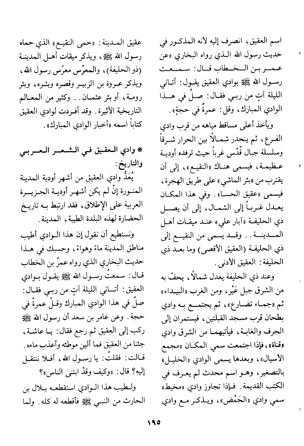 وعند ذي الحليفة يعدل شمالا، يحفّ به من الشرق جبل عير، ومن الغرب «البيداء» ثم «جماء تضارع» ، ثم يجتمع به وادي بطحان قرب مسجد القبلتين، فيستمران إلى الجرف والغابة، فيأتيهما من الشرق وادي «قناة» ، فإذا اجتمعت سمي المكان «مجمع الأسيال» ، وبعدها يسمى الوادي «الخليل» بالتصغير، وهو اسم محدث لم يعرف في الكتب القديمة. فإذا تجاوز وادي «مخيط» سمي وادي «الحمض» ، ويذكر مع وادي عقيق المدينة: «حمى النقيع» الذي حماه رسول الله صلّى الله عليه وسلّم، ويذكر ميقات أهل المدينة (ذو الحليفة) ، والمعرّس معرّس رسول الله، ويذكر عروة بن الزبير وقصره وبئره، وبئر رومة، أو بئر عثمان.. وكثير من المعالم التاريخية الأثيرة. وقد أفردت لوادي العقيق كتابا اسمه «أخبار الوادي المبارك» .