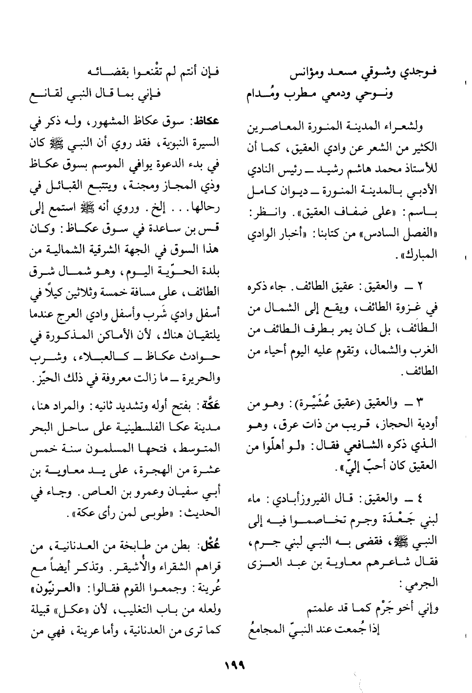4- والعقيق: قال الفيروز أبادي: ماء لبني جعدة وجرم تخاصموا فيه إلى النبي صلّى الله عليه وسلّم، فقضى به النبي لبني جرم، فقال شاعرهم معاوية بن عبد العزى الجرمي: