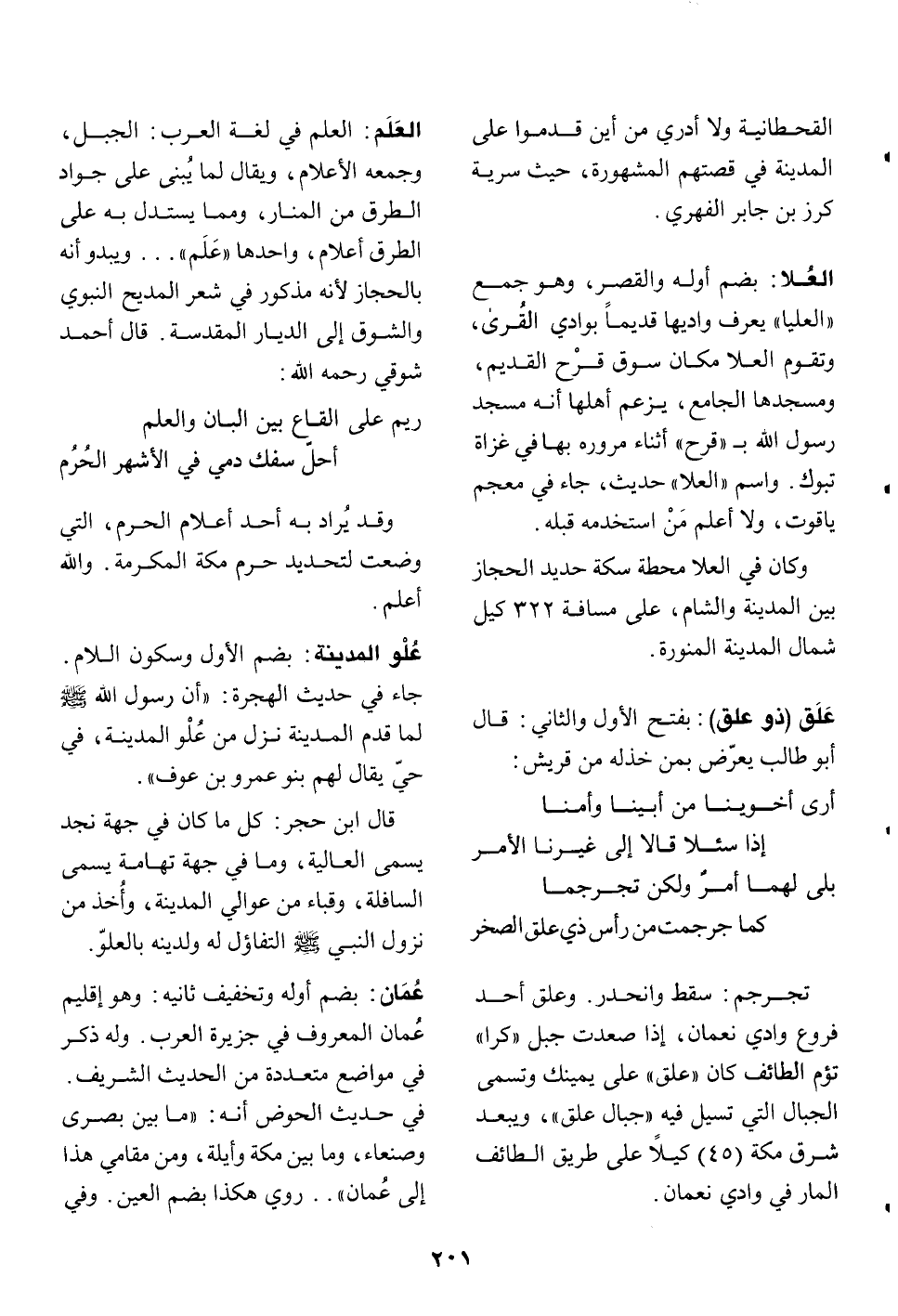 العلم: العلم في لغة العرب: الجبل، وجمعه الأعلام، ويقال لما يا بنى على جواد الطرق من المنار، ومما يستدل به على الطرق أعلام، واحدها «علم» ... ويبدو أنه بالحجاز لأنه مذكور في شعر المديح النبوي والشوق إلى الديار المقدسة. قال أحمد شوقي رحمه الله: