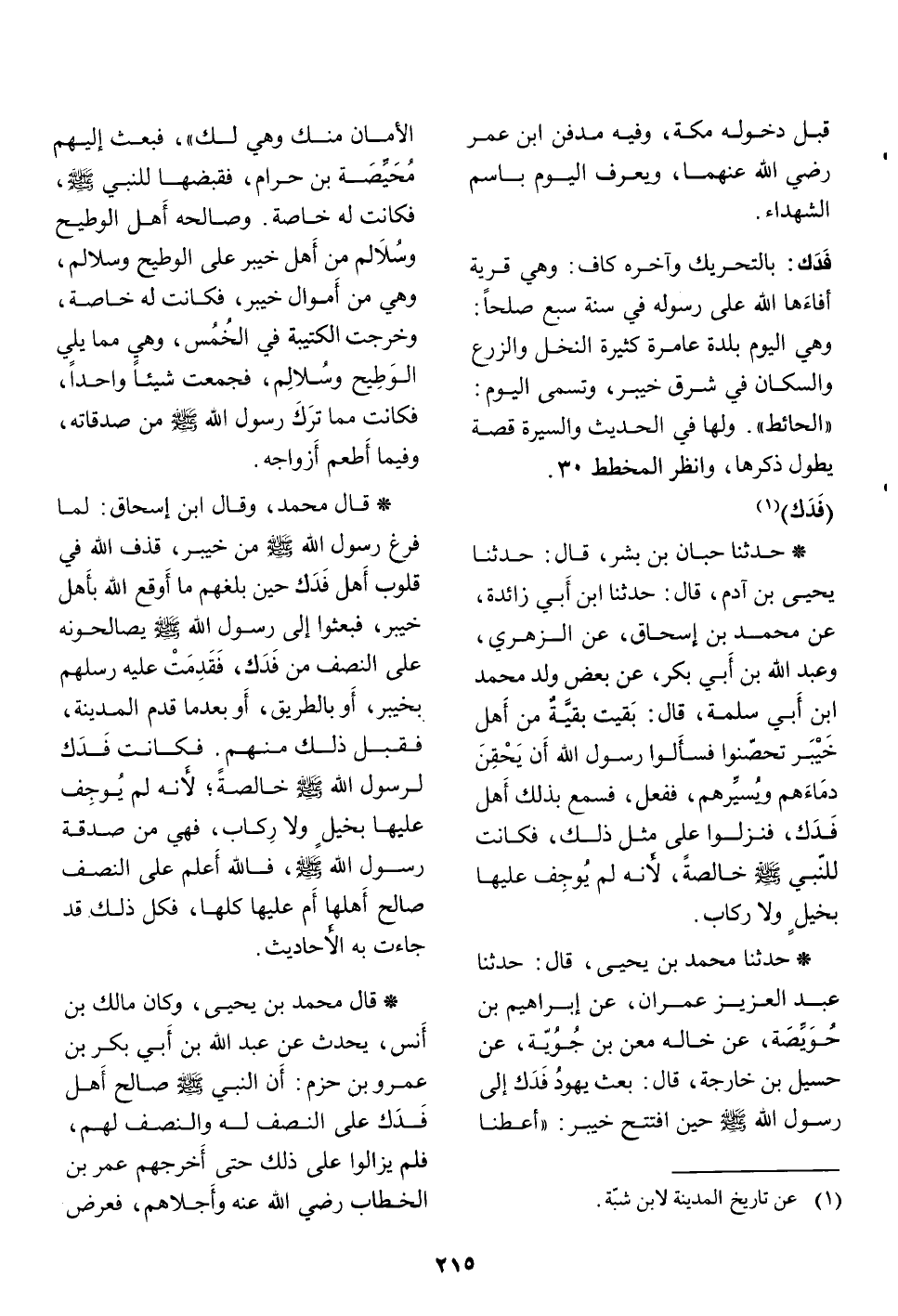 * قال محمد بن يحيى، وكان مالك بن أنس، يحدث عن عبد الله بن أبي بكر بن عمرو بن حزم: أن النبي صلّى الله عليه وسلّم صالح أهل فدك على النصف له والنصف لهم، فلم يزالوا على ذلك حتى أخرجهم عمر بن الخطاب رضي الله عنه وأجلاهم، فعرض