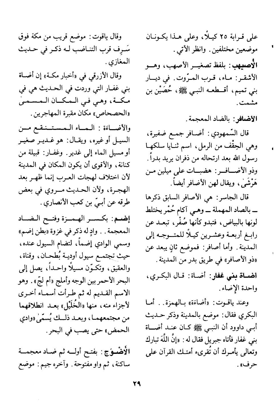 وعند ياقوت: «أضاءة» بالهمزة.. أما البكري فقال: موضع بالمدينة وذكر حديث أبي داوود أن النبي صلّى الله عليه وسلّم كان عند أضاة بني غفار فأتاه جبريل فقال له: «إنّ الله تبارك وتعالى يأمرك أن تقرىء أمتك القرآن على حرف» .