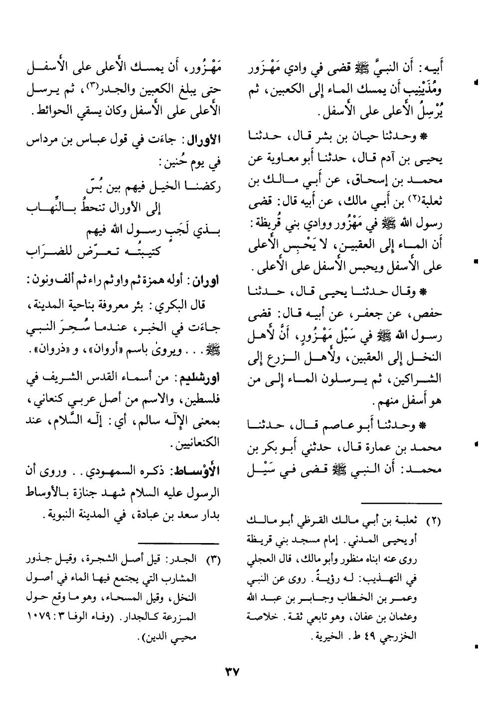 * وحدثنا حيان بن بشر قال، حدثنا يحيى بن آدم قال، حدثنا أبو معاوية عن محمد بن إسحاق، عن أبي مالك بن ثعلبة «2» بن أبي مالك، عن أبيه قال: قضى رسول الله صلّى الله عليه وسلّم في مهزور ووادي بني قريظة: