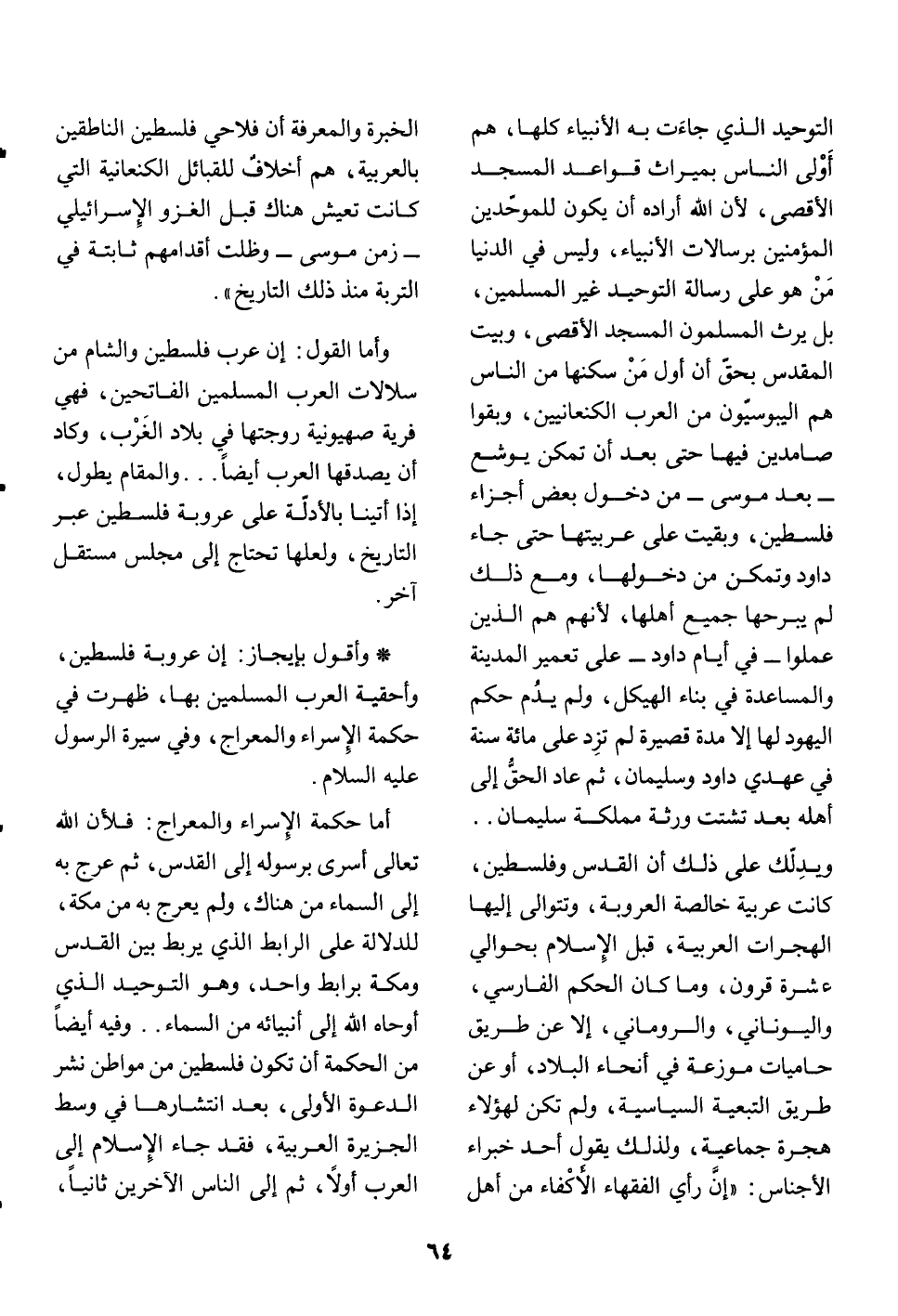 * وأقول بإيجاز: إن عروبة فلسطين، وأحقية العرب المسلمين بها، ظهرت في حكمة الإسراء والمعراج، وفي سيرة الرسول عليه السلام.