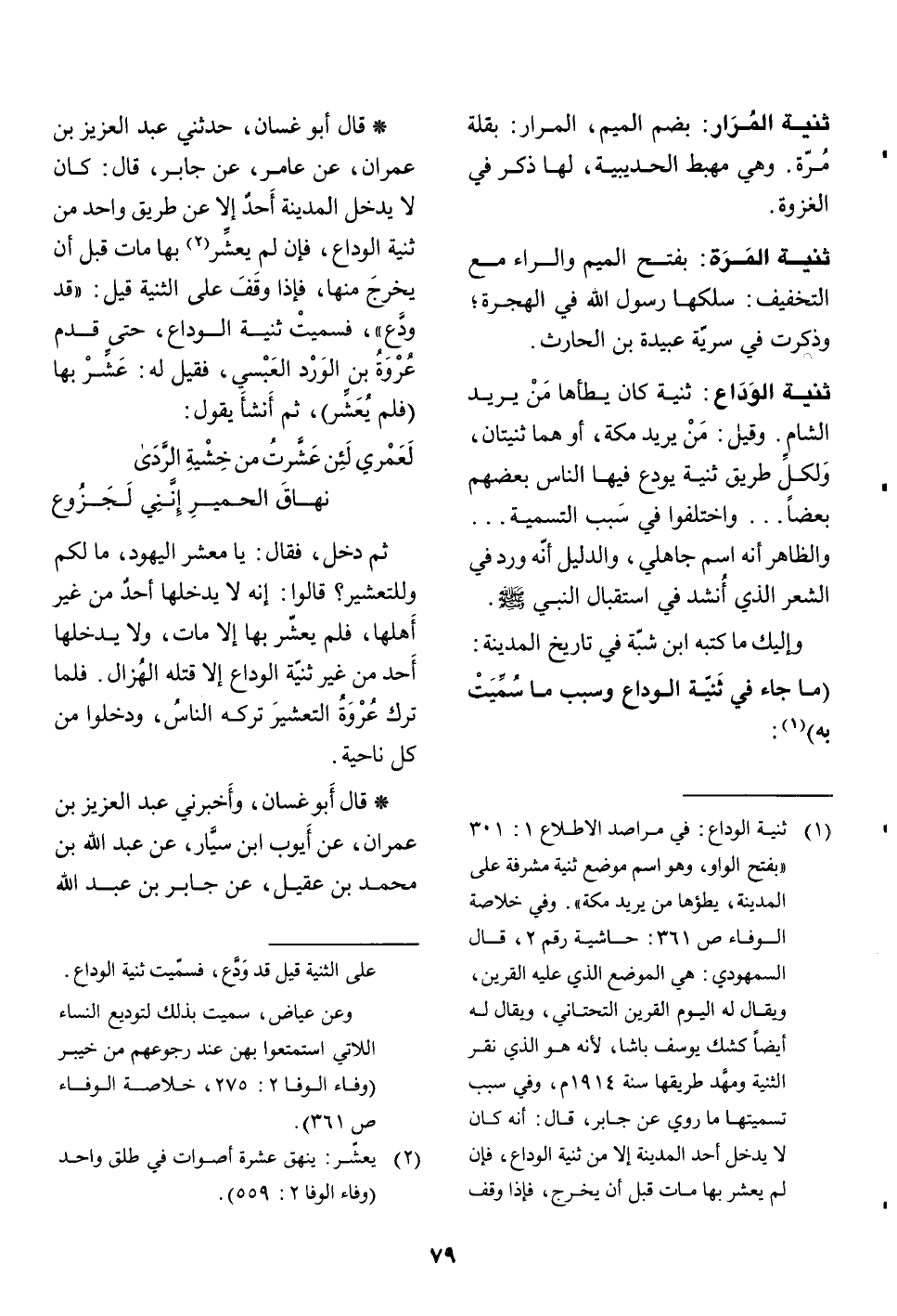 (1) ثنية الوداع: في مراصد الاطلاع 1: 301 «بفتح الواو، وهو اسم موضع ثنية مشرفة على المدينة، يطؤها من يريد مكة» . وفي خلاصة الوفاء ص 361: حاشية رقم 2، قال السمهودي: هي الموضع الذي عليه القرين، ويقال له اليوم القرين التحتاني، ويقال له أيضا كشك يوسف باشا، لأنه هو الذي نقر الثنية ومهّد طريقها سنة 1914 م، وفي سبب تسميتها ما روي عن جابر، قال: أنه كان لا يدخل أحد المدينة إلا من ثنية الوداع، فإن لم يعشر بها مات قبل أن يخرج، فإذا وقف