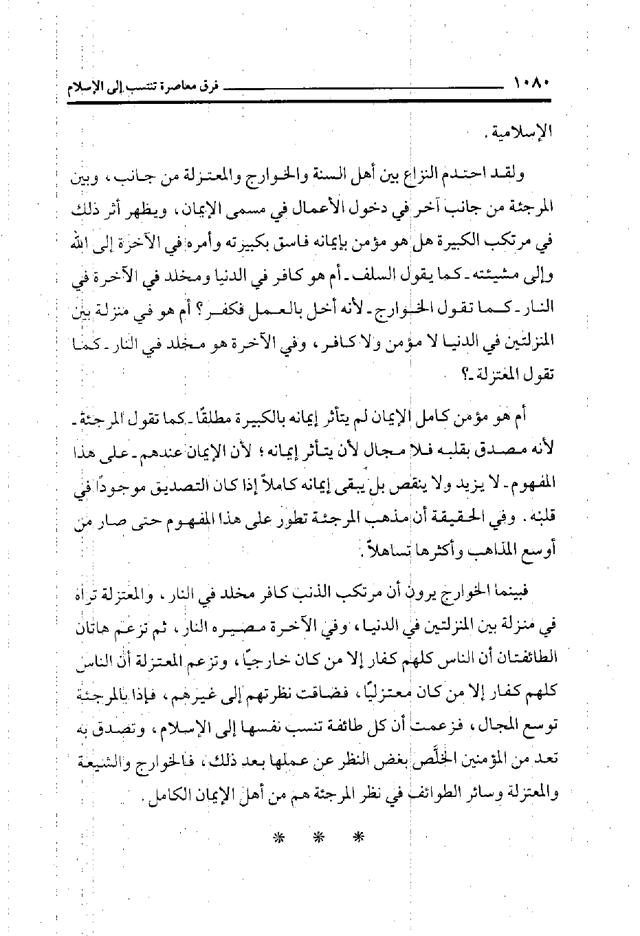 ولقد احتدم النزاع بين أهل السنة والخوارج والمعتزلة من جانب، وبين المرجئة من جانب آخر في دخول الأعمال في مسمى الإيمان، ويظهر أثر ذلك في مرتكب الكبيرة هل هو مؤمن بإيمانه فاسق بكبيرته وأمره في الآخرة إلى الله وإلى مشيئته- كما يقول السلف- أم هو كافر في الدنيا ومخلد في الآخرة في النار- كما تقول الخوارج- لأنه أخل بالعمل فكفر؟ أم هو في منزلة بين المنزلتين في الدنيا لا مؤمن ولا كافر، وفي الآخرة هو مخلد في النار- كما تقول المعتزلة-؟