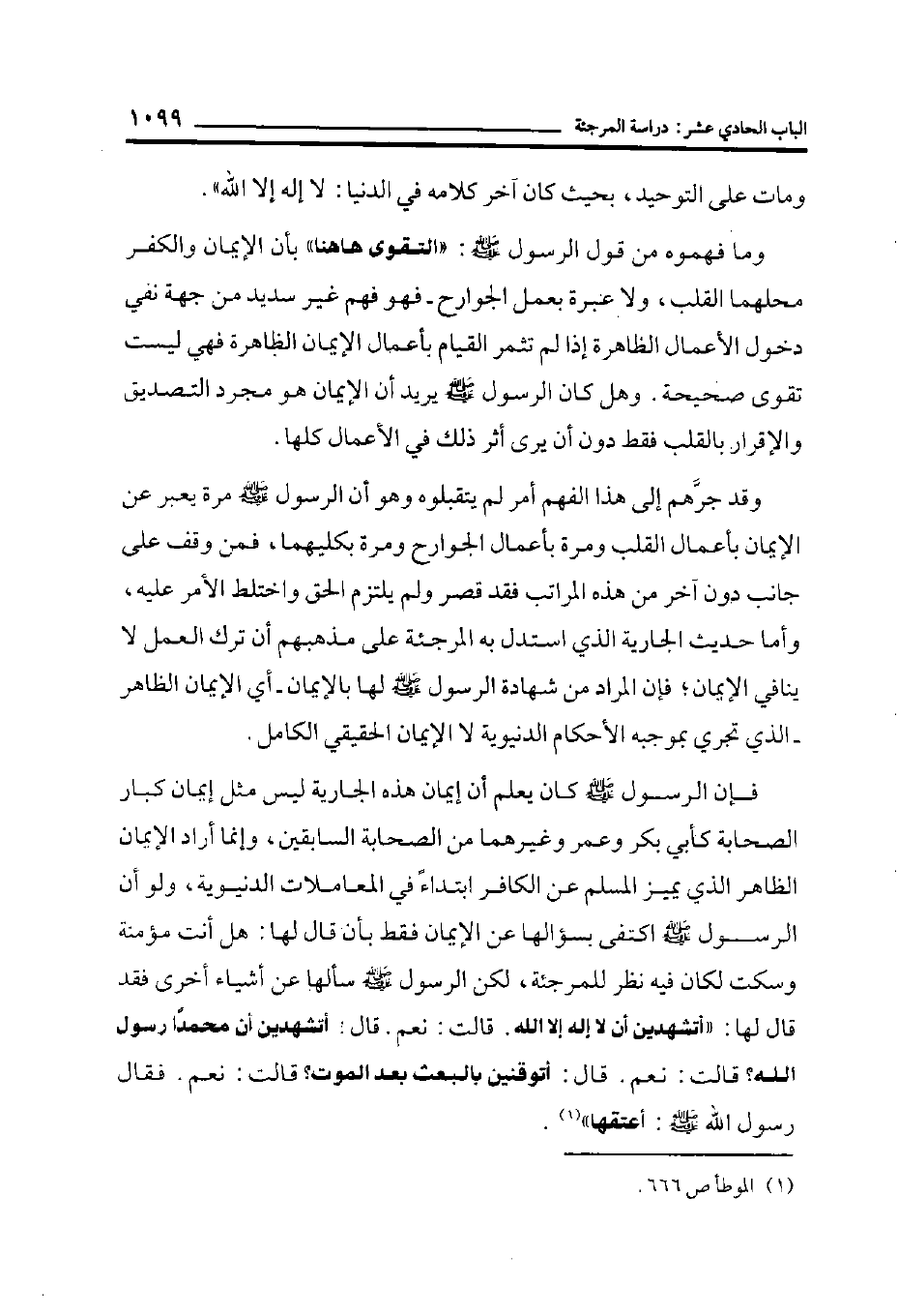 فإن الرسول صلى الله عليه وسلم كان يعلم أن إيمان هذه الجارية ليس مثل إيمان كبار الصحابة كأبي بكر وعمر وغيرهما من الصحابة السابقين، وإنما أراد الإيمان الظاهر الذي يميز المسلم عن الكافر ابتداءً في المعاملات الدنيوية، ولو أن الرسول صلى الله عليه وسلم اكتفى بسؤالها عن الإيمان فقط بأن قال لها: هل أنت مؤمنة وسكت لكان فيه نظر للمرجئة، لكن الرسول صلى الله عليه وسلم سألها عن أشياء أخرى فقد قال لها: "أتشهدين أن لا إله إلا الله. قالت: نعم. قال: أتشهدين أن محمداً رسول الله؟ قالت: نعم. قال: أتوقنين بالبعث بعد الموت؟ قالت: نعم. فقال رسول الله صلى الله عليه وسلم: أعتقها" (¬1) .