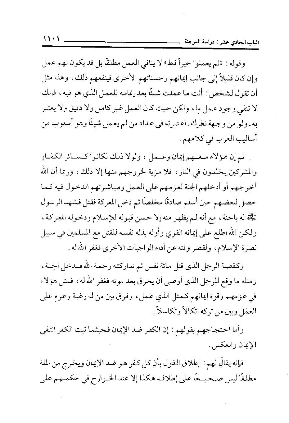 ثم إن هؤلاء معهم إيمان وعمل، ولولا ذلك لكانوا كسائر الكفار والمشركين يخلدون في النار، فلا مزية لخروجهم منها إلا ذلك، وربما أن الله أخرجهم أو أدخلهم الجنة لعزمهم على العمل ومباشرتهم الدخول فيه كما حصل لبعضهم حين أسلم صادقاً مخلصاً ثم دخل المعركة فقتل فشهد الرسول صلى الله عليه وسلم له بالجنة، مع أنه لم يظهر منه إلا حسن قبوله للإسلام ودخوله المعركة، ولكن الله اطلع على إيمانه القوي وأوله بذله نفسه للقتل مع المسلمين في سبيل نصرة الإسلام، ولقصر وقته عن أداء الواجبات الأخرى فغفر الله له.