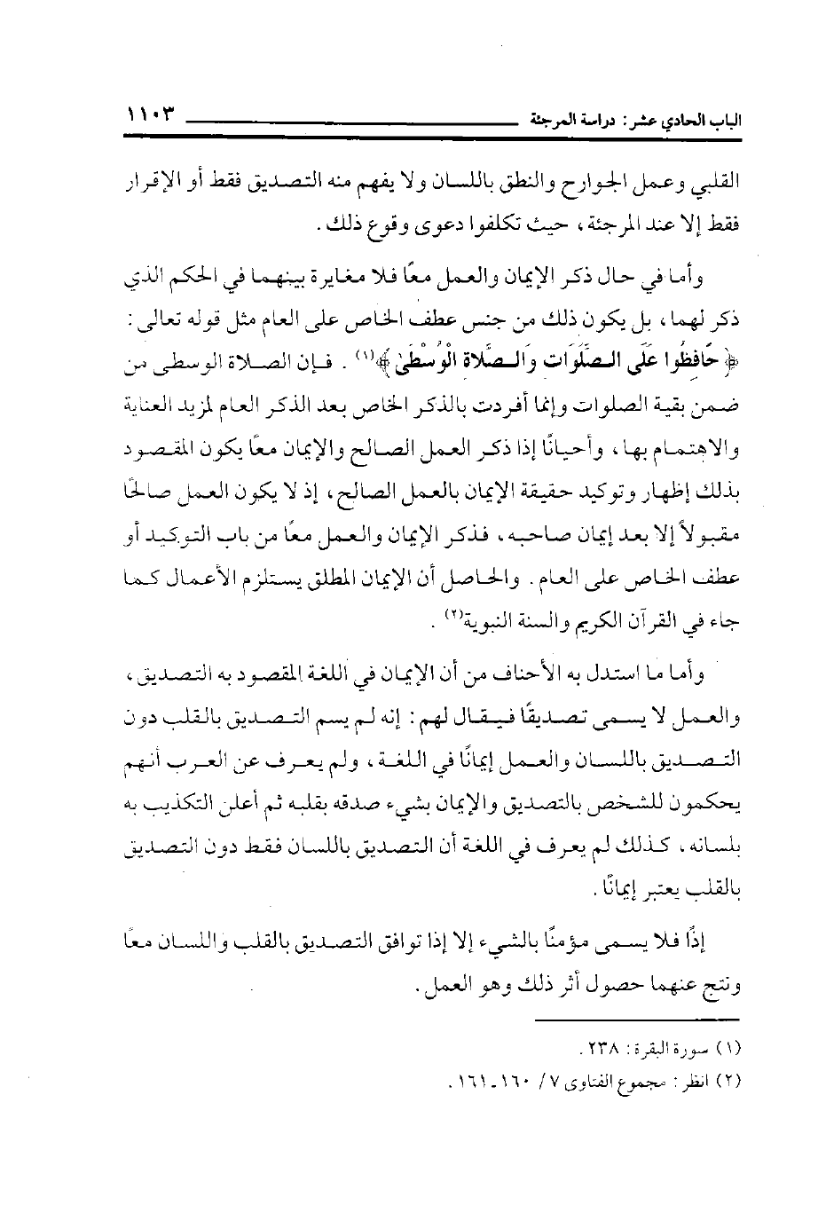 وأما في حال ذكر الإيمان والعمل معاً فلا مغايرة بينهما في الحكم الذي ذكر لهم، بل يكون ذلك من جنس عطف الخاص على العام مثل قوله تعالى: {حافظوا على الصلوات والصلاة الوسطى} (¬1) . فإن الصلاة الوسطى من ضمن بقية الصلوات وإنما أفردت بالذكر الخاص بعد الذكر العام لمزيد العناية والاهتمام بها، وأحياناً إذا ذكر العمل الصالح والإيمان معاً يكون المقصود بذلك إظهار وتوكيد حقيقة الإيمان بالعمل الصالح، إذ لا يكون العمل صالحاً مقبولاً إلا بعد إيمان صاحبه، فذكر الإيمان والعمل معاً من باب التوكيد أو عطف الخاص على العام. والحاصل أن الإيمان المطلق يستلزم الأعمال كما جاء في القرآن الكريم والسنة النبوية (¬2) .
