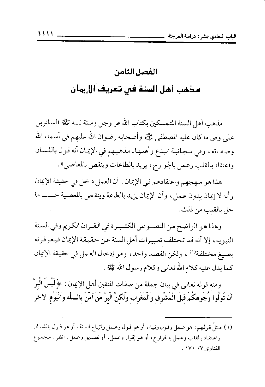 مذهب أهل السنة المتمسكين بكتاب الله عز وجل وسنة نبيه صلى الله عليه وسلم السائرين علي وفق ما كان عليه المصطفي صلى الله عليه وسلم وأصحابه رضوان الله عليهم في أسماء الله وصفاته، وفي مجانبة البدع وأهلها - مذهبهم في الإيمان أنه قول باللسان واعتقاد بالقلب وعمل بالجوارح، يزيد بالطاعات وينقص بالمعاصي".