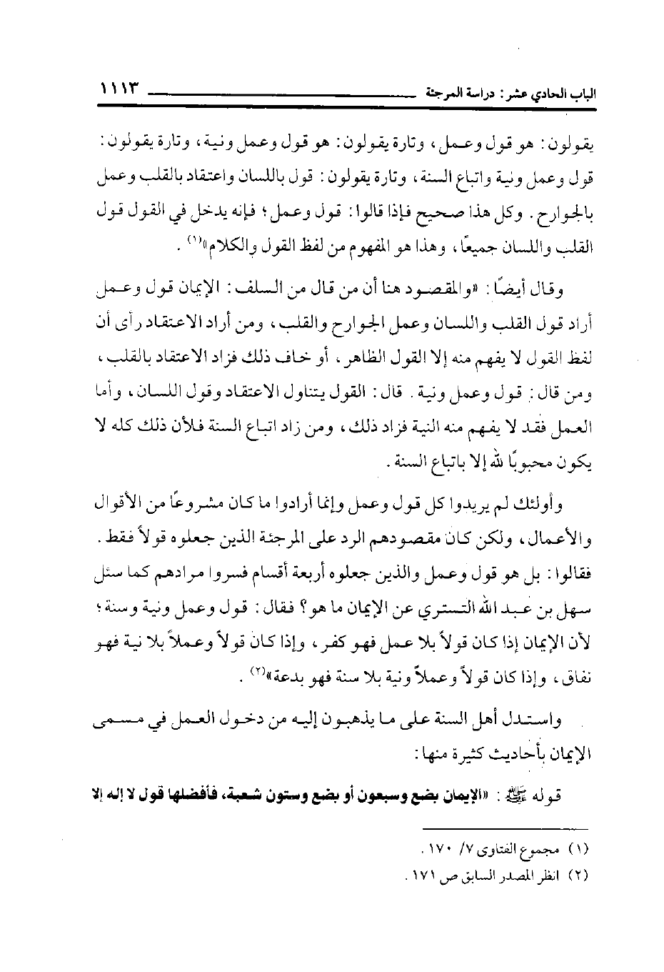 وأولئك لم يريدوا كل قول وعمل وإنما أرادوا ما كان مشروعاً من الأقوال والأعمال ولكن كان مقصودههم الرد علي المرجئة الذين جعلوه قولا فقط. فقالوا: بل هو قول وعمل والذين جعلوه أربعة أقسام فسروا مرادهم كما سئل سهل بن عبد الله التستري عن الإيمان ما هو؟ فقال: قول وعمل ونية وسنة؛ لأن الإيمان إذا كان قولاً بلا عمل فهو كفر، وإذا كان قولاً وعملاً بلا نية فهو نفاق، وإذا كان قولاً وعملاً ونية بلا سنة فهو بدعة" (¬2) .