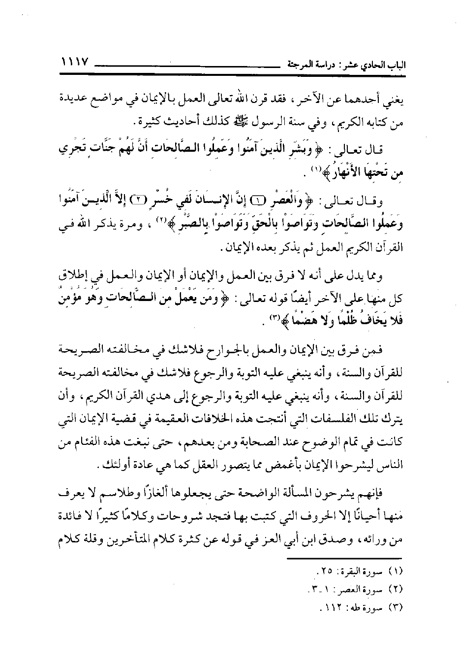 ومما يدل علي أنه لا فرق بين العمل والإيمان أو الإيمان والعمل في إطلاق كل منها علي الآخر أيضاً قوله تعالي: {ومن يعمل من الصالحات وهو مؤمن فلا يخاف ظلماً ولا هضماً} (¬3) .