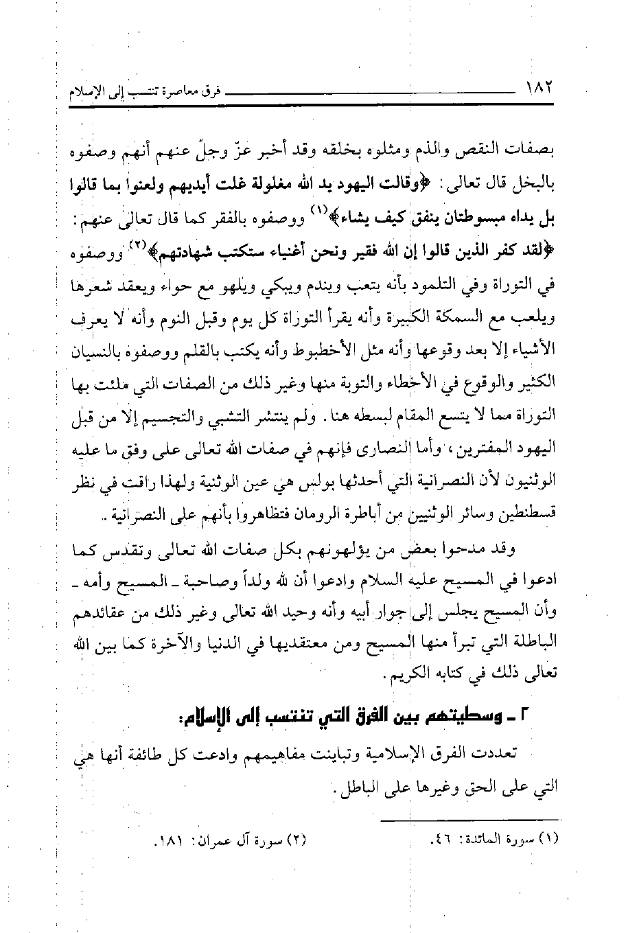 بصفات النقص والذم ومثلوه بخلقه وقد أخبر عزّ وجلّ عنهم أنهم وصفوه بالبخل قال تعالى: {وَقَالَتِ الْيَهُودُ يَدُ اللَّهِ مَغْلُولَةٌ غُلَّتْ أَيْدِيهِمْ وَلُعِنُوا بِمَا قَالُوا بَلْ يَدَاهُ مَبْسُوطَتَانِ يُنْفِقُ كَيْفَ يَشَاءُ} (¬1) ووصفوه بالفقر كما قال تعالى عنهم {لقد كفر الذين قالوا إن الله فقير ونحن أغنياء ستكتب شهادتهم} (¬2) ووصفوه في التوراة وفي التلمود بأنه يتعب ويندم ويبكي ويلهو مع حواء ويعقد شعرها ويلعب مع السمكة الكبيرة وأنه يقرأ التوراة كل يوم وقبل النوم وأنه لا يعرف الأشياء إلا بعد وقوعها وأنه مثل الإخطبوط وأنه يكتب بالقلم ووصفوه بالنسيان الكثير والوقوع في الأخطاء والتوبة منها وغير ذلك من الصفات التي ملئت بها التوراة مما لا يتسع المقام لبسطه هنا. ولم ينتشر التشبيه والتجسيم إلا من قبل اليهود المفترين، وأما النصارى فإنهم في صفات الله تعالى على وفق ما عليه الوثنيون لأن النصرانية التي أحدثها بولس هي عين الوثنية ولهذا راقت في نظر قسطنطين وسائر الوثنيين من أباطرة الرومان فتظاهروا بأنهم على النصرانية.