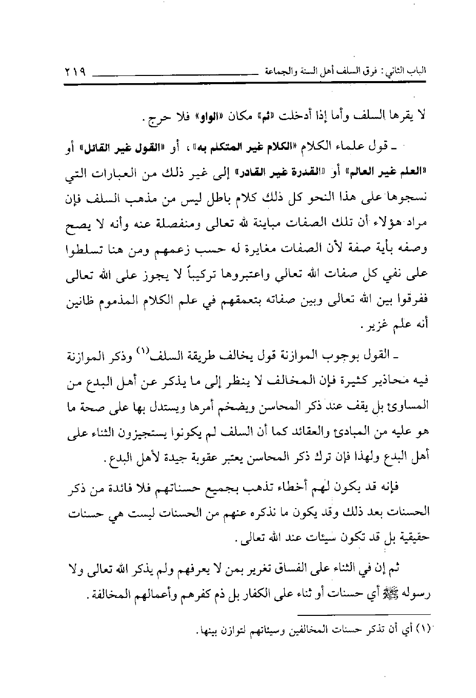قول علماء الكلام "الكلام غير المتكلم به"، أو "القول غير القائل" أو "العلم غير العالم" أو "القدرة غير القادر" إلى غير ذلك من العبارات التي نسجوها على هذا النحو كل ذلك كلام باطل ليس من مذهب السلف فإن مراد هؤلاء أن تلك الصفات مباينة لله تعالى ومنفصلة عنه وأنه لا يصح وصفه بأية صفة لأن الصفات مغايرة له حسب زعمهم ومن هنا تسلطوا على نفي كل صفات الله تعالى واعتبروها تركيباً لا يجوز على الله تعالى ففرقوا بين الله تعالى وبين صفاته بتعمقهم في علم الكلام المذموم ظانين أنه علم غزير.