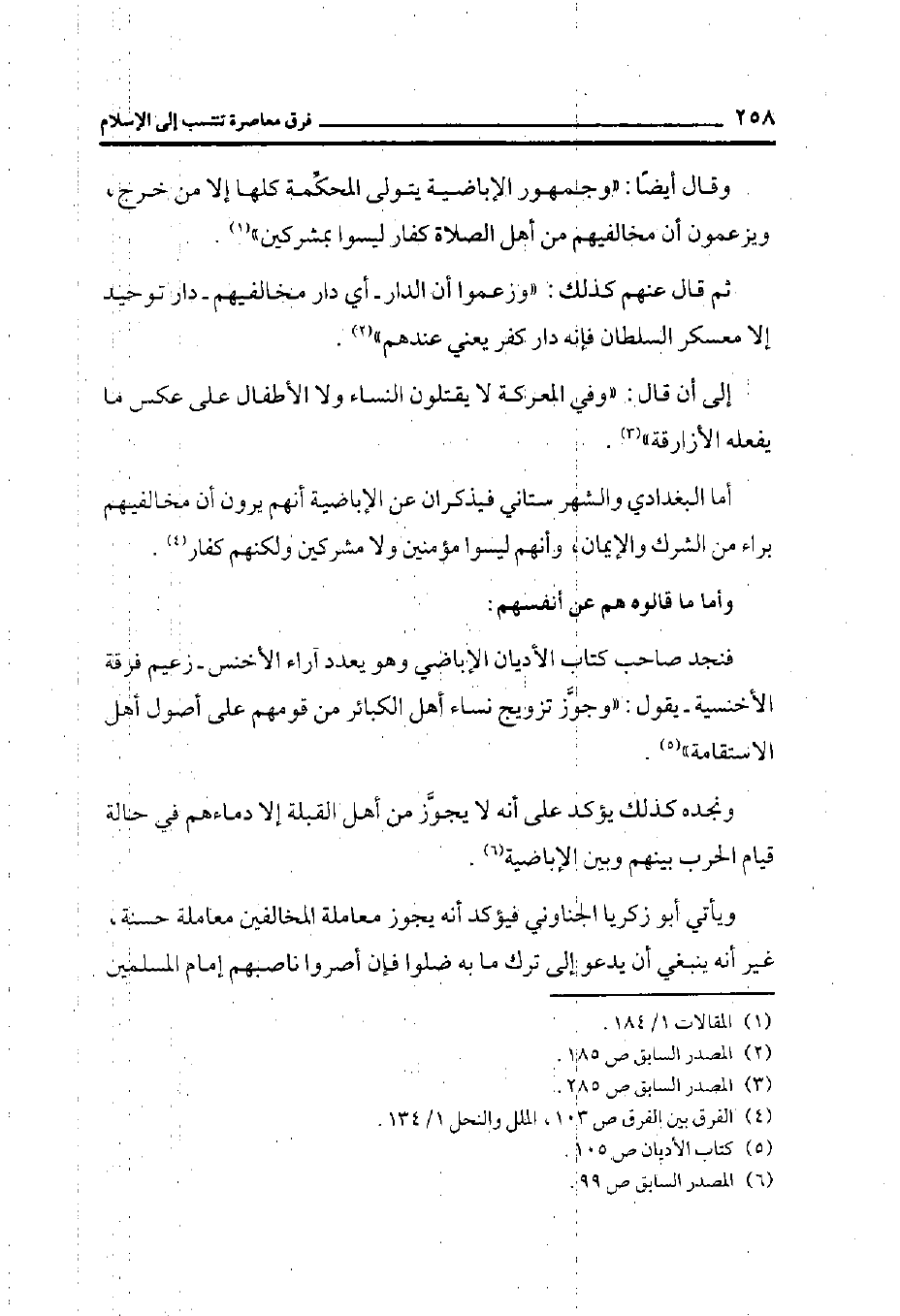 وقال أيضاً: ((وجمهور الإباضية يتولى المحكِّمة كلها إلا من خرج، ويزعمون أن مخالفيهم من أهل الصلاة كفار ليسوا بمشركين)) (¬1) .