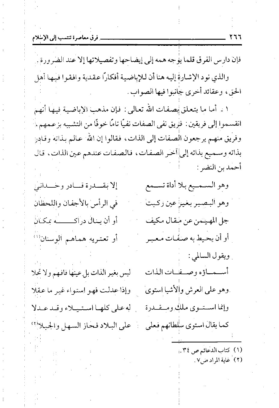 1- أما ما يتعلق بصفات الله تعالى: فإن مذهب الإباضية فيها أنهم انقسموا إلى فريقين: فريق نفى الصفات نفياً تاماً خوفاً من التشبيه بزعمهم، وفريق منهم يرجعون الصفات إلى الذات فقالوا أن الله عالم بذاته وقادر بذاته وسميع بذاته إلخ الصفات فالصفات عندهم عين الذات، قال أحمد بن النضر: