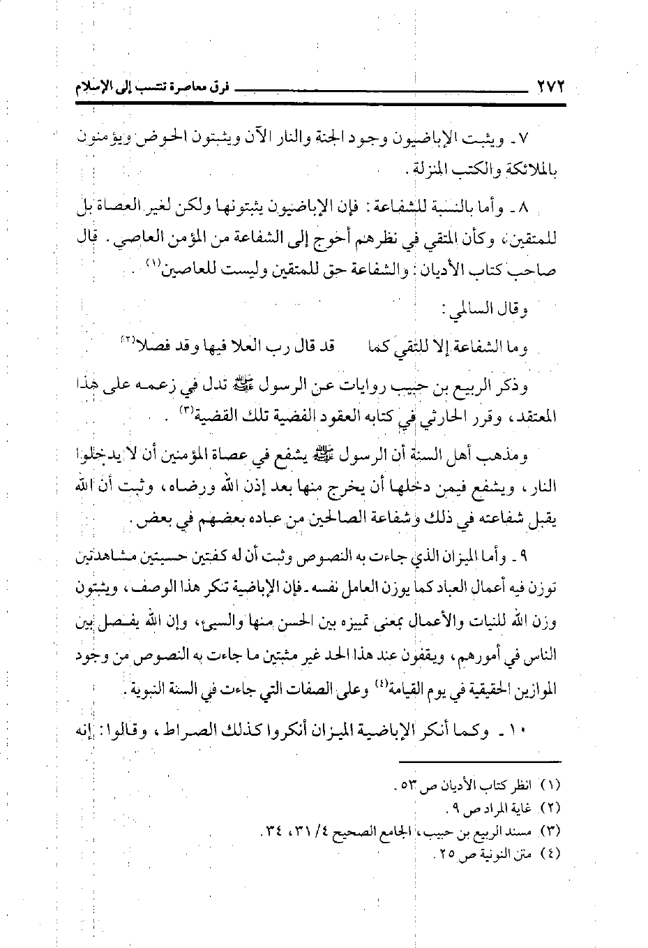 8- وأما بالنسبة للشفاعة: فإن الإباضية يثبتونها ولكن لغير العصاة للمتقين وكأن المتقى في نظرهم أحوج إلى الشفاعة من المؤمن العاصي. قال صاحب كتاب الأديان - والشفاعة حق للمتقين وليست للعاصين (¬1) .