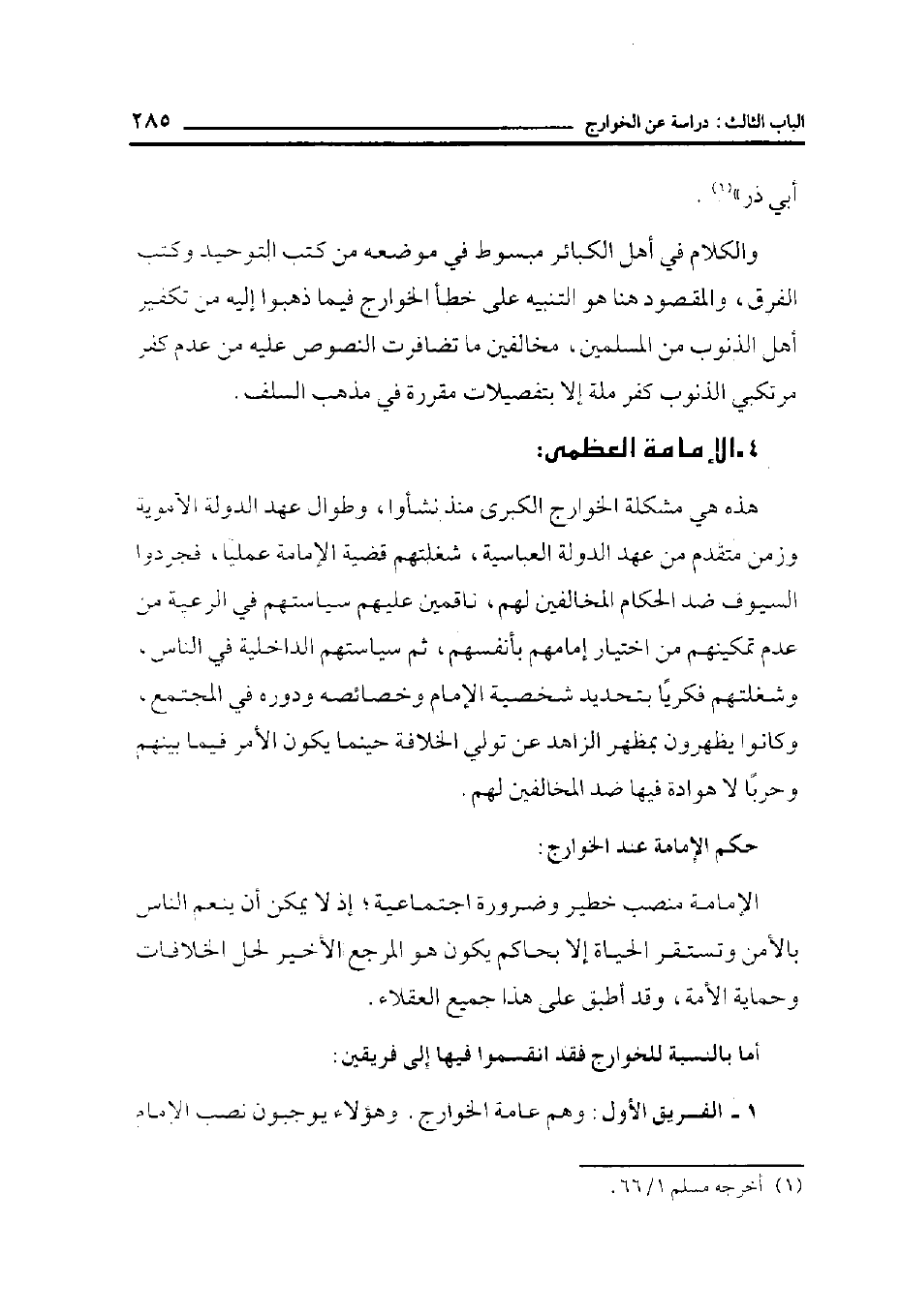1- الفرق الأول: وهم عامة الخوارج. وهؤلاء يوجبون نصب الإمام