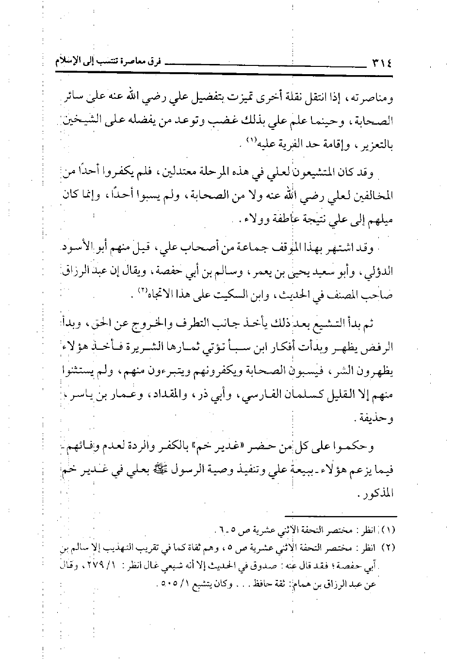 (¬2) انظر مختصر التحفة الاثني عشرية صـ5 وهم ثقاة كما في تقريب التهذيب إلا سالم بن أبي حفصة فقد قال عنه صدوق في الحديث إلا أنه شيعي غال انظر صـ279 جـ1 وقال عن عبد الرزاق بن همام ثقة حافظ.. وكان يتشيع جـ1 صـ505.
