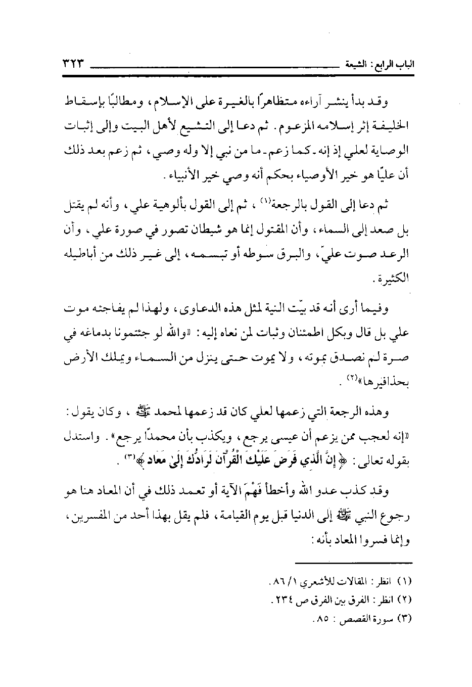 وهذه الرجعة التي زعمها لعلي كان قد زعمها لمحمد صلى الله عليه وسلم، وكان يقول: ((إنه ليعجب ممن يزعم أن عيسى يرجع، ويكذب بأن محمداً يرجع)) . واستدل بقوله تعالى: {إِنَّ الَّذِي فَرَضَ عَلَيْكَ الْقُرْآنَ لَرَادُّكَ إِلَى مَعَادٍ} (¬3) .