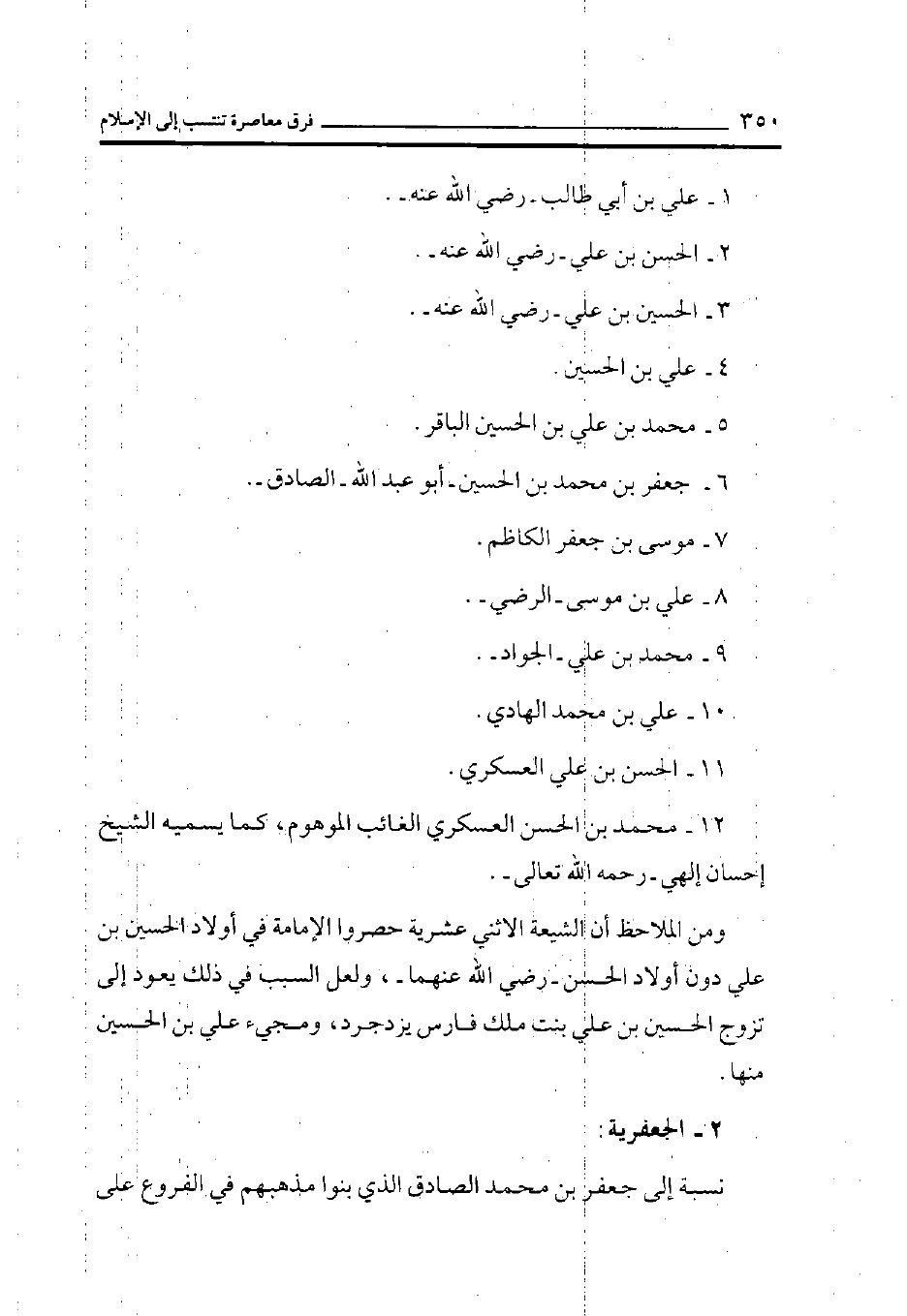 12. محمد بن الحسن العسكري الغائب الموهوم، كما يسميه الشيخ إحسان إلهي -رحمه الله تعالى -، ومن الملاحظ أن الشيعة الاثني عشرية حصروا الإمامة في أولاد الحسين بن علي دون أولاد الحسن -رضي الله عنهما-، ولعل السبب في ذلك يعود إلى تزوج الحسين بن علي بنت ملك فارس يزدجرد، ومجيء علي بن الحسين منها.