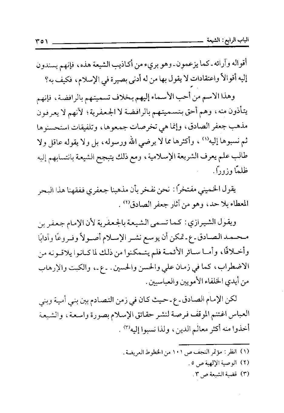 لكن الإمام الصادق -ع- حيث كان في زمن التصادم بين بني أمية وبني العباس اغتنم الموقف فرصة لنشر حقائق الإسلام بصورة واسعة، والشيعة أخذوا منه أكثر معالم الدين، ولذا نسبوا إليه (¬3) .