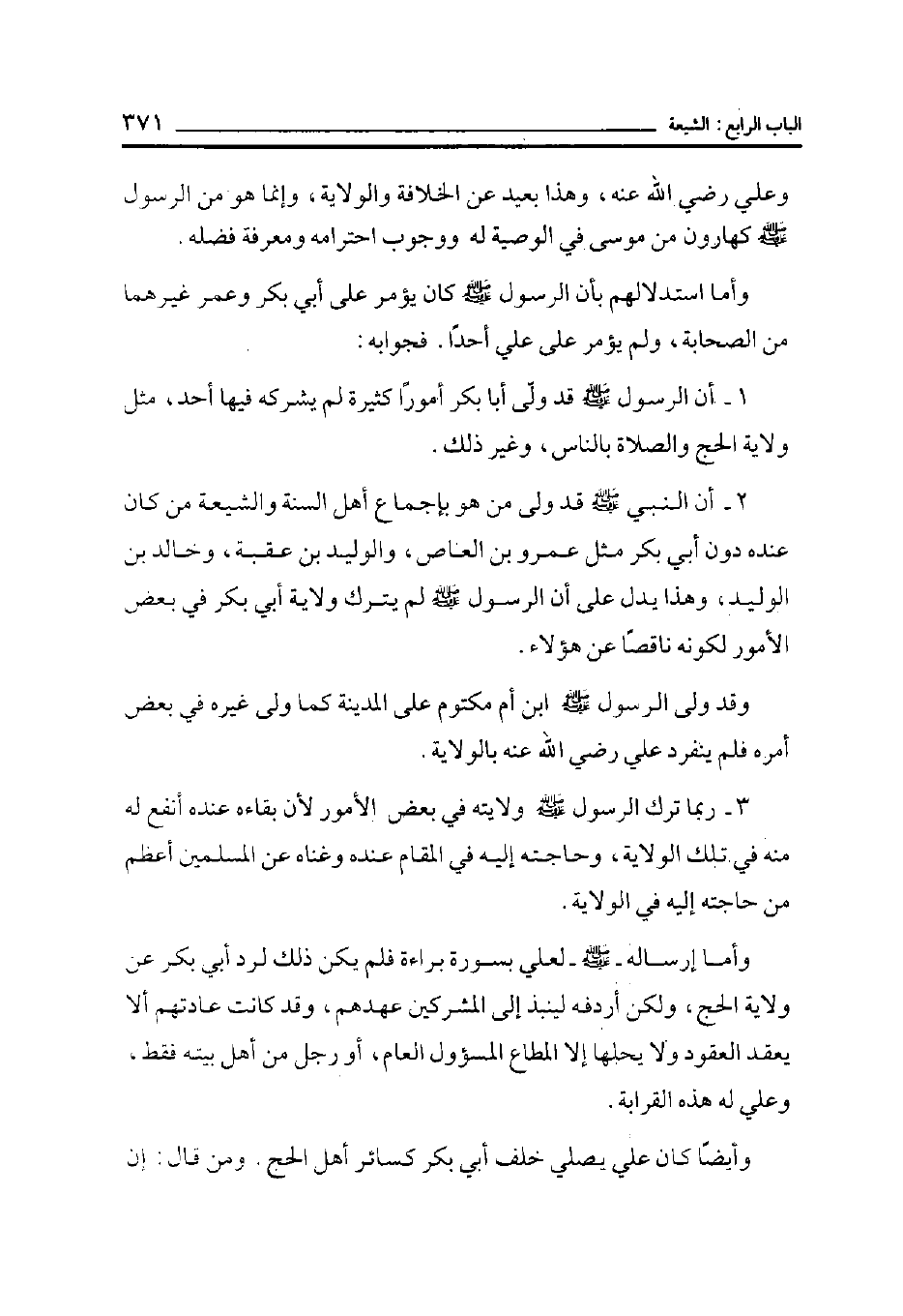 2- أن النبي صلى الله عليه وسلم قد ولى من هو بإجماع أهل السنة والشيعة من كان عنده دون أبي بكر مثل عمرو بن العاص، والوليد بن عقبة، وخالد بن الوليد، وهذا يدل على أن الرسول صلى الله عليه وسلم لم يترك ولاية أبي بكر في بعض الأمور لكونه ناقصاً عن هؤلاء.