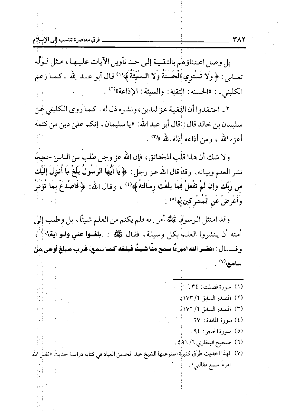 ولا شك أن هذا قلب للحقائق، فإن الله عز وجل طلب من الناس جميعاً نشر العلم وبيانه. وقد قال الله عز وجل: {يَا أَيُّهَا الرَّسُولُ بَلِّغْ مَا أُنْزِلَ إِلَيْكَ مِنْ رَبِّكَ وَإِنْ لَمْ تَفْعَلْ فَمَا بَلَّغْتَ رِسَالَتَهُ} (¬4) ، وقال الله: {فَاصْدَعْ بِمَا تُؤْمَرُ وَأَعْرِضْ عَنِ الْمُشْرِكِينَ} (¬5) .