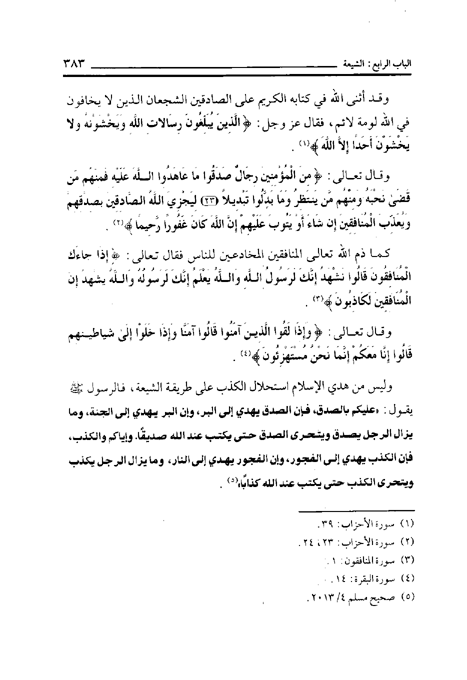 وليس من هدي الإسلام استحلال الكذب على طريقة الشيعة، فالرسول صلى الله عليه وسلم يقول: ((عليكم بالصدق، فإن الصدق يهدي إلى البر، وإن البر يهدي إلى الجنة، وما يزال الرجل يصدق ويتحرى الصدق حتى يكتب عند الله عند الله صديقاً. وإياكم والكذب، فإن الكذب يهدي إلى الفجور، وإن الفجور يهدي إلى النار، وما يزال الرجل يكذب ويتحرى الكذب حتى يكتب عند الله كذاباً)) (¬5) .