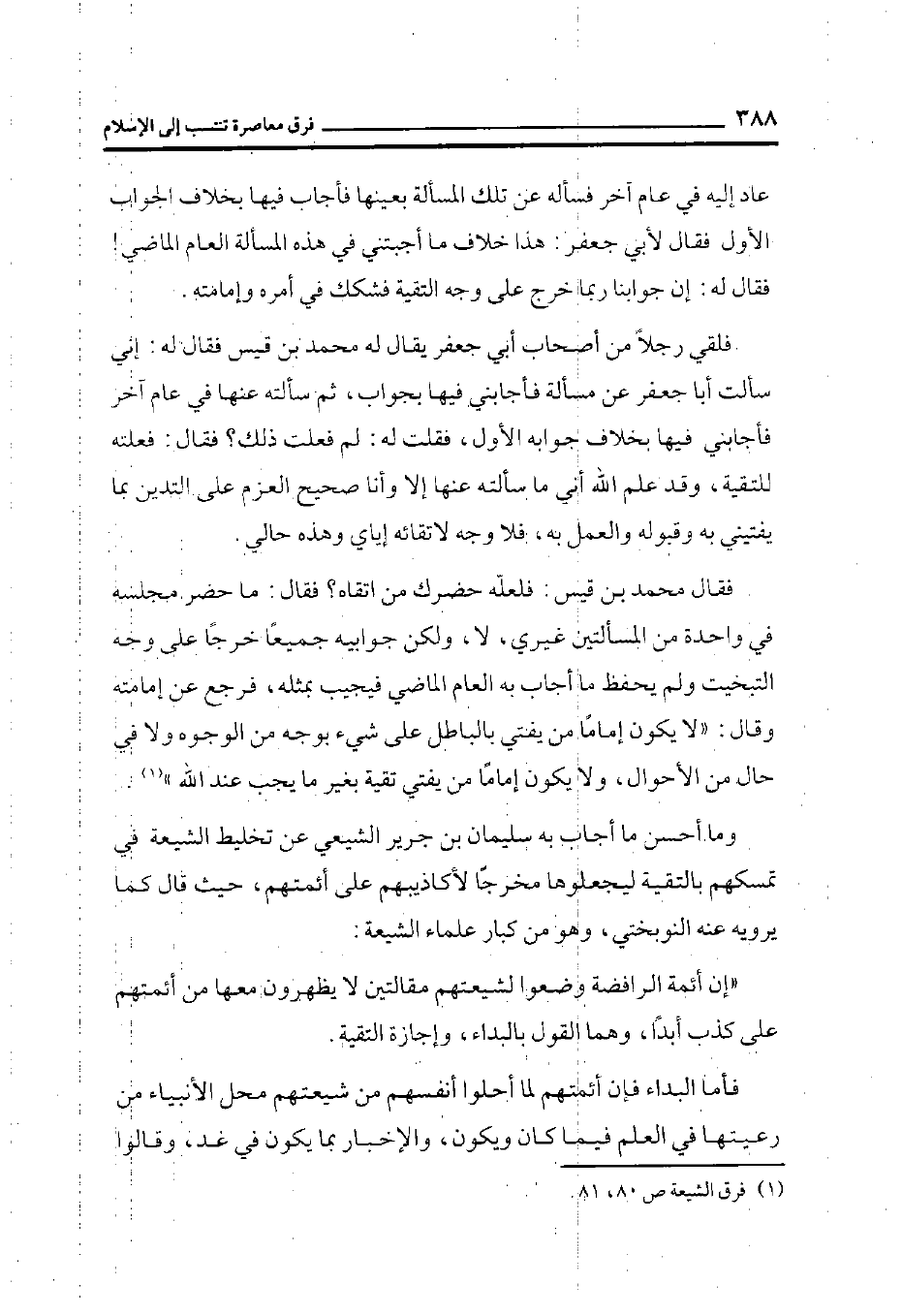 ((إن أئمة الرافضة وضعوا لشيعتهم مقالتين لا يظهرون معها من أئمتهم على كذب أبداً، وهما القول بالبداء، وإجازة التقية. فأما البداء فإن أئمتهم لما أحلوا أنفسهم من شيعتهم محل الأنبياء من رعيتها في العلم فيما كان ويكون، والإخبار بما يكون في غد، وقالوا