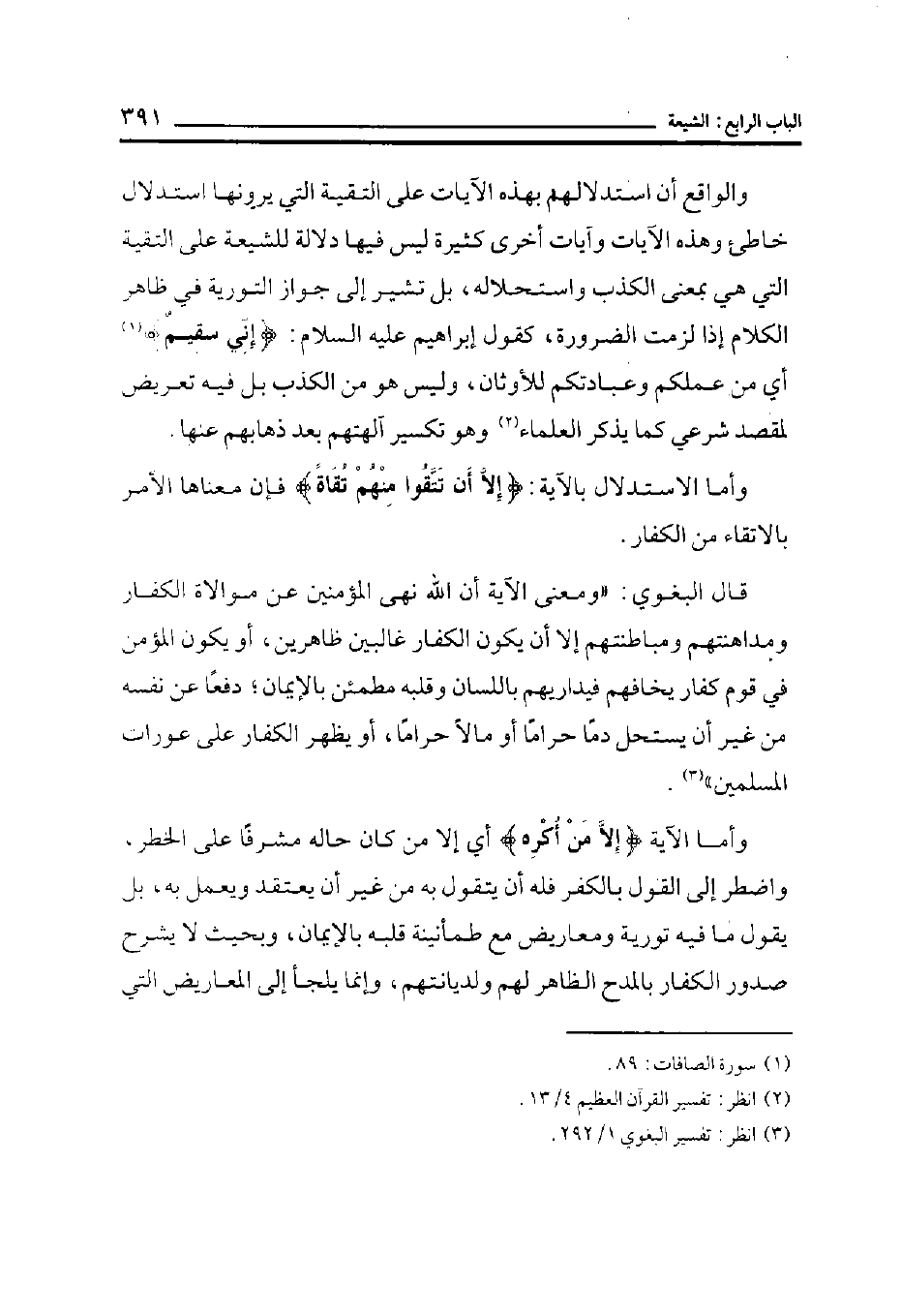 والواقع أن استدلالهم بهذه الآيات على التقية التي يرونها استلال خاطئ وهذه الآيات وآيات أخرى كثيرة ليس فيها دلالة للشيعة على التقية التي هي بمعنى الكذب واستحلاله، بل تشير إلى جواز التورية في ظاهر الكلام إذا لزمت الضرورة، كقول إبراهيم عليه السلام: {إِنِّي سَقِيمٌ} (¬1) أي من عملكم وعبادتكم للأوثان، وليس هو من الكذب بل فيه تعريض لمقصد شرعي كما يذكر العلماء (¬2) وهو تكسير آلهتهم بعد ذهابهم عنها.