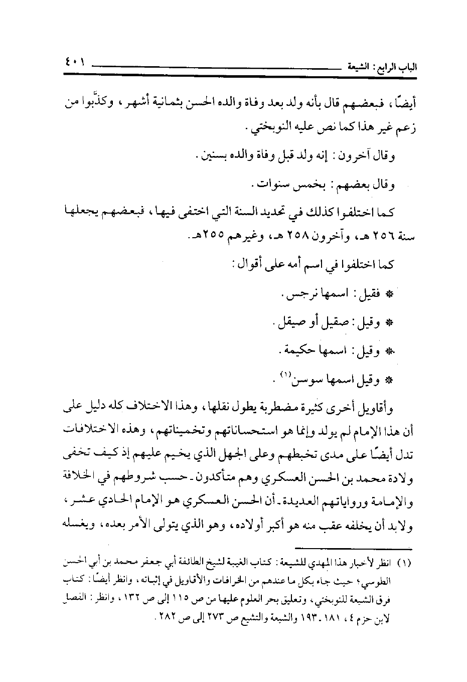 (¬1) انظر لأخبار هذا المهدي للشيعة ((كتاب الغيبة)) لشيخ الطائفة أبي محمد بن الحسن الطوسي حيث جاء بكل ما عندهم من الخرفات والأقاويل في إثباته، وانظر أيضاً كتاب فرق الشيعة للنوبختي وتعليق بحر العلوم عليها من ص 115 إلى ص 132، وانظر الفصل لابن حزم ج 4 ص 193 وصـ 181 والشيعة والتشيع ص 273 إلى ص 282.