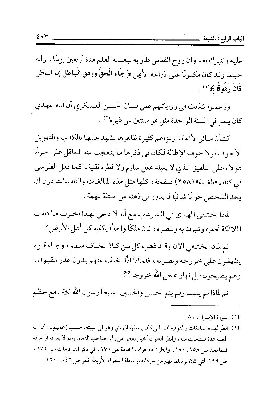 كشأن سائر الأئمة، ومزاعم كثيرة ظاهرها يشهد عليها بالكذب والتهويل الأجوف لولا خوف الإطالة لكان في ذكرها ما يتعجب من العاقل على جرأة هؤلاء على التلفيق الذي لا يقبله عقل سليم ولا فطرة نقية، كما فعل الطوسي في كتاب (الغيبة)) (258) صفحة، كلها مثل هذه المبالغات والتلفيقات دون أن يجد الشخص جواباً شافياً لما يدور في ذهنه من أسئلة مهمة.