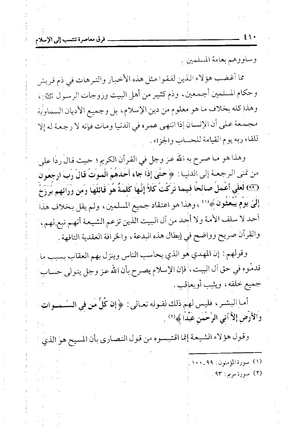 وهذا هو ما صرح به الله عز وجل في القرآن الكريم؛ حيث قال رداً على من تمنى الرجعة إلى الدنيا: {حَتَّى إِذَا جَاءَ أَحَدَهُمُ الْمَوْتُ قَالَ رَبِّ ارْجِعُونِ (99) لَعَلِّي أَعْمَلُ صَالِحاً فِيمَا تَرَكْتُ كَلَّا إِنَّهَا كَلِمَةٌ هُوَ قَائِلُهَا وَمِنْ وَرَائِهِمْ بَرْزَخٌ إِلَى يَوْمِ يُبْعَثُونَ} (¬1) ، وهذا هو اعتقاد جميع المسلمين، ولم يقل بخلاف هذا أحد لا سلف الأمة ولا أحد من آل البيت الذي تزعم الشيعة أنهم تبع لهم، والقرآن صريح وواضح في إبطال هذه البدعة، والخرافة العقدية التافهة.