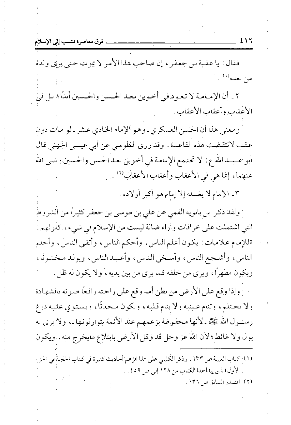 (¬1) كتاب الغيبة ص 133. وذكر الكلينى على هذا الزعم أحاديث كثيرة في كتاب الحجة في الجزء الأول الذي يبدأ هذا الكتاب من 128 إلى 459.