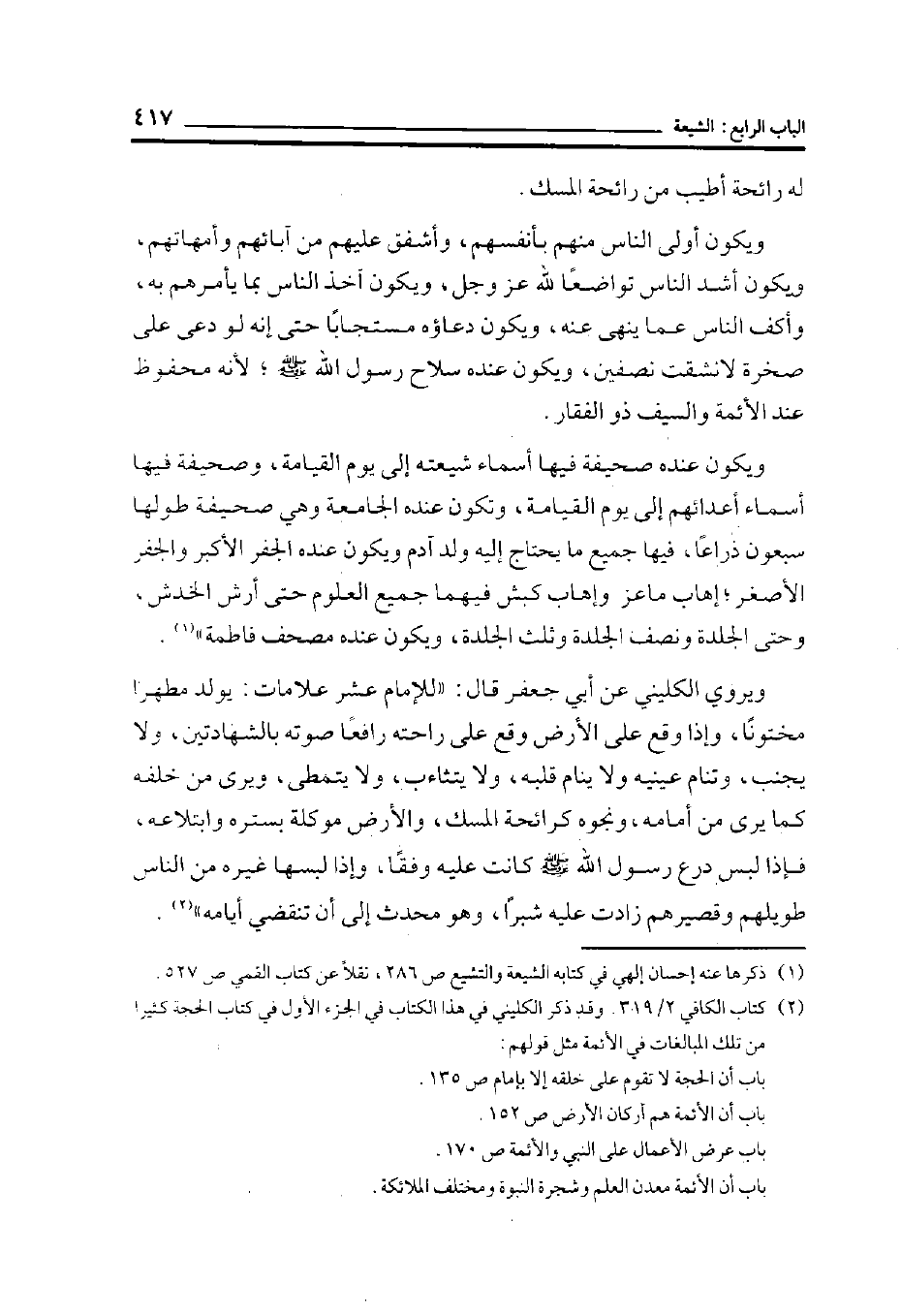 ويروي الكليني عن أبي جعفر قال: ((للإمام عشر علامات: يولد مطهرا مختوناً، وإذا وقع على الأرض وقع على راحته رافعاً صوته بالشهادتين، ولا يجنب، وتنام عينيه ولا ينام قلبه، ولا يتثاءب، ولا يتمطى، ويرى من خلفه كما يرى من أمامه، ونجوه كرائحة المسك، والأرض موكلة بستره وابتلاعه، فإذا لبس درع رسول الله صلى الله عليه وسلم كانت عليه وفقاً، وإذا لبسها غيره من الناس طويلهم وقصيرهم زادت عليه شبراً، وهو محدث إلى أن تنقضي أيامه)) (¬2) .