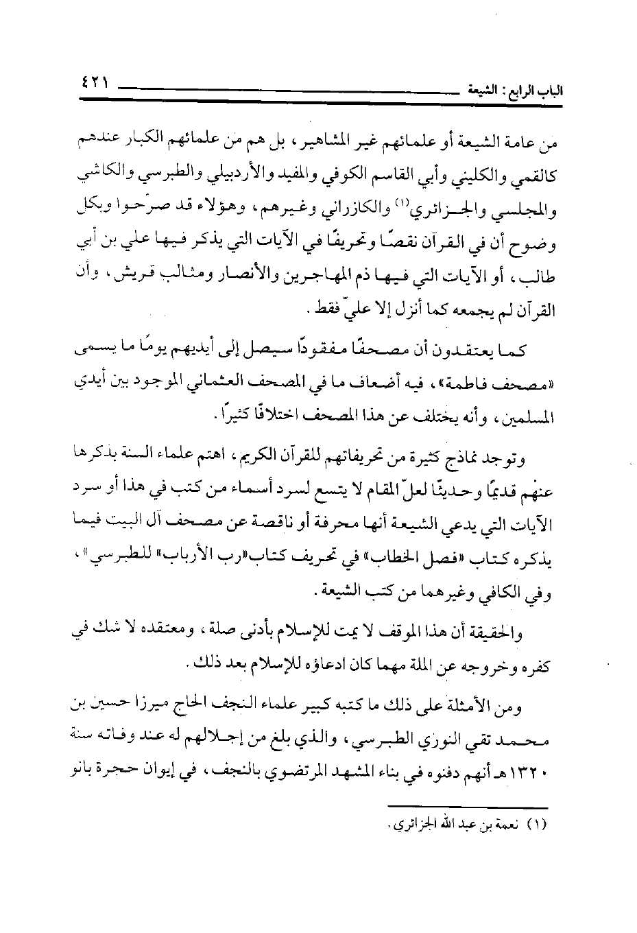 من عامة الشيعة أو علمائهم غير المشاهير، بل هم من علمائهم الكبار عندهم كالقمي والكليني وأبي القاسم الكوفي والمفيد والأردبيلي والطبرسي والكاشي والمجلسي والجزائري (¬1) والكازراني وغيرهم، وهؤلاء قد صرّحوا وبكل وضوح أن في القرآن نقصاً وتحريفاً في الآيات التي يذكر فيها علي بن أبي طالب، أو الآيات التي فيها ذم المهاجرين والأنصار ومثالب قريش، وأن القرآن لم يجمعه كما أنزل إلا عليّ فقط.