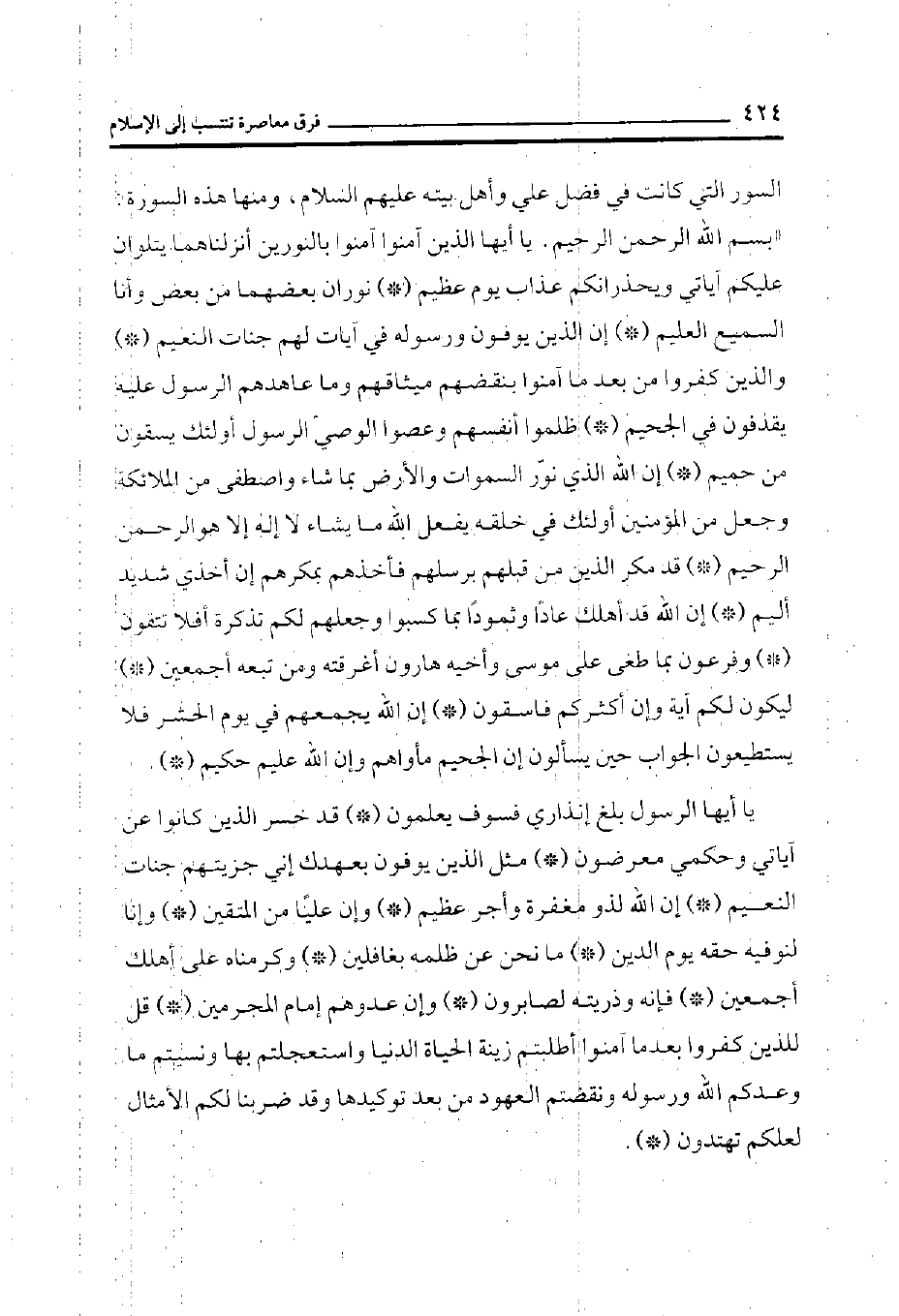 السور التي كانت في فضل علي وأهل بيته عليهم السلام، ومنها هذه السورة: ((بسم الله الرحمن الرحيم الله الرحمن الرحيم. يا أيها الذين آمنوا آمنوا بالنورين أنزلناهما يتلوان عليكم آياتي ويحذرانكم عذاب يوم عظيم (*) نوران بعضهما من بعض وأنا السميع العليم (*) إن الذين يوفون ورسوله في آيات لهم جنات النعيم (*) والذين كفروا من بعد ما آمنوا بنقضهم ميثاقهم وما عاهدهم الرسول عليه يقذفون في الجحيم (*) ظلموا أنفسهم وعصوا الوصيّ الرسول أولئك يسقون من حميم (*) إن الله الذي نوّر السموات والأرض بما شاء واصطفى من الملائكة وجعل من المؤمنين أولئك في خلقه يفعل الله ما يشاء لا إله إلا هو الرحمن الرحيم (*) قد مكر الذين من قبلهم برسلهم فأخذهم بمكرهم إن أخذي شديد أليم (*) إن الله قد أهلك عاداً وثموداً بما كسبوا وجعلهم لكم تذكرة أفلا تتقون (*) وفرعون بما طغى على موسى وأخيه هارون أغرقته ومن تبعه أجمعين (*) ليكون لكم آية وإن أكثركم فاسقون (*) إن الله يجمعهم في يوم الحشر فلا يستطيعون الجواب حين يسألون إن الجحيم مأواهم وإن الله عليم حكيم (*) .