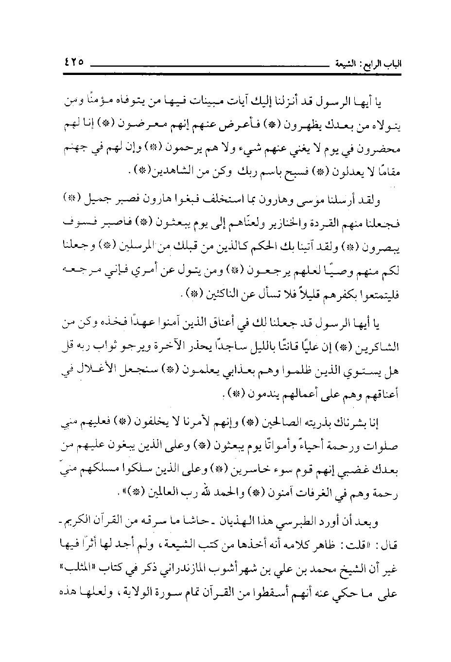 وبعد أن أورد الطبرسي هذا الهذيان -حاشا ما سرقه من القرآن الكريم- قال: ((قلت: ظاهر كلامه أنه أخذها من كتب الشيعة، ولم أجد لها أثراً فيها غير أن الشيخ محمد بن علي بن شهر أشوب المازندراني ذكر في كتاب ((المثلب)) على ما حكي عنه أنهم أسقطوا من القرآن تمام سورة الولاية، ولعلها هذه