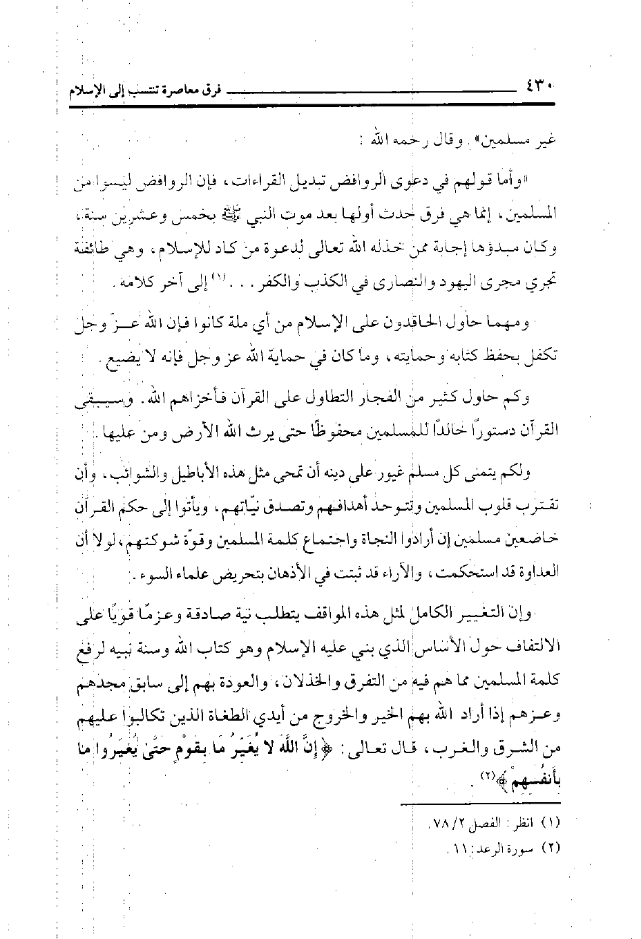((وأما قولهم في دعوى الروافض تبديل القراءات، فإن الروافض ليسوا من المسلمين، إنما هي فرق حدث أولها بعد موت النبي صلى الله عليه وسلم بخمس وعشرين سنة، وكان مبدؤها إجابة ممن خذله الله تعالى لدعوى من كاد للإسلام، وهي طائفة تجري مجرى اليهود والنصارى في الكذب والكفر ... (¬1) إلى آخر كلامه.