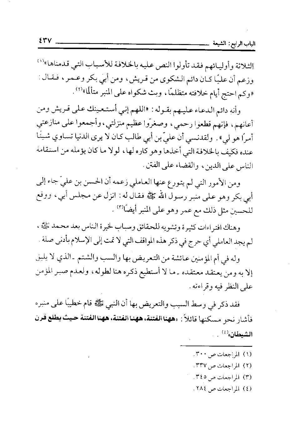 الثلاثة وأوليائهم فقد تأولوا النص عليه بالخلافة للأسباب التي قدمناها)) (¬1) وزعم أن علياً كان دائم الشكوى من قريش، ومن أبي بكر وعمر، فقال: ((وكم احتج أيام خلافته متظلماً، وبث شكواه على المنبر متألماً)) (¬2) .