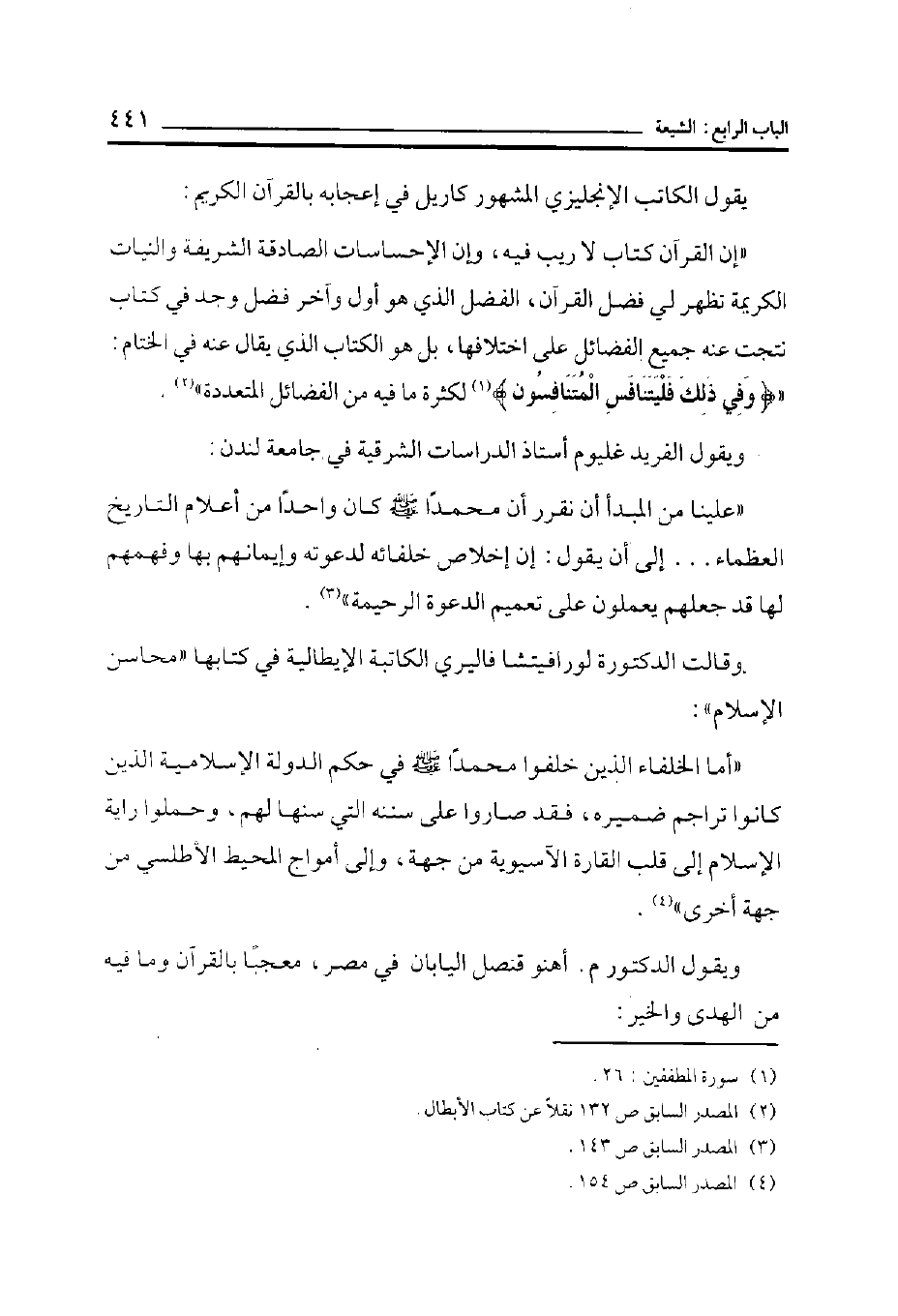 ((إن القرآن كتاب لا ريب فيه، وإن الإحساسات الصادقة الشريفة والنيات الكريمة تظهر لي فضل القرآن، الفضل الذي هو أول وآخر فضل وجد في كتاب نتجت عنه جميع الفضائل على اختلافها، بل هو الكتاب الذي يقال عنه في الختام: (( {وَفِي ذَلِكَ فَلْيَتَنَافَسِ الْمُتَنَافِسُونَ} (¬1) لكثرة ما فيه من الفضائل المتعددة)) (¬2) .