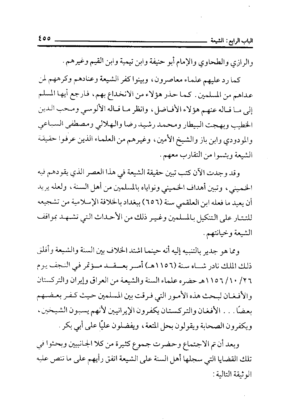 ومما هو جدير بالتنبيه إليه أنه حينما اشتد الخلاف بين السنة والشيعة وأقلق ذلك الملك نادر شاه سنة (1156هـ) أمر بعقد مؤتمر في النجف يوم 26/10/1156هـ حضره علماء السنة والشيعة من العراق وإيران والتركستان والأفغان لبحث هذه الأمور التي فرقت بين المسلمين حيث كفّر بعضهم بعضاً ... الأفغان والتركستان يكفرون الإيرانيين لأنهم يسبون الشيخين، ويكفرون الصحابة ويقولون بحل المتعة، ويفضلون علياً على أبي بكر.