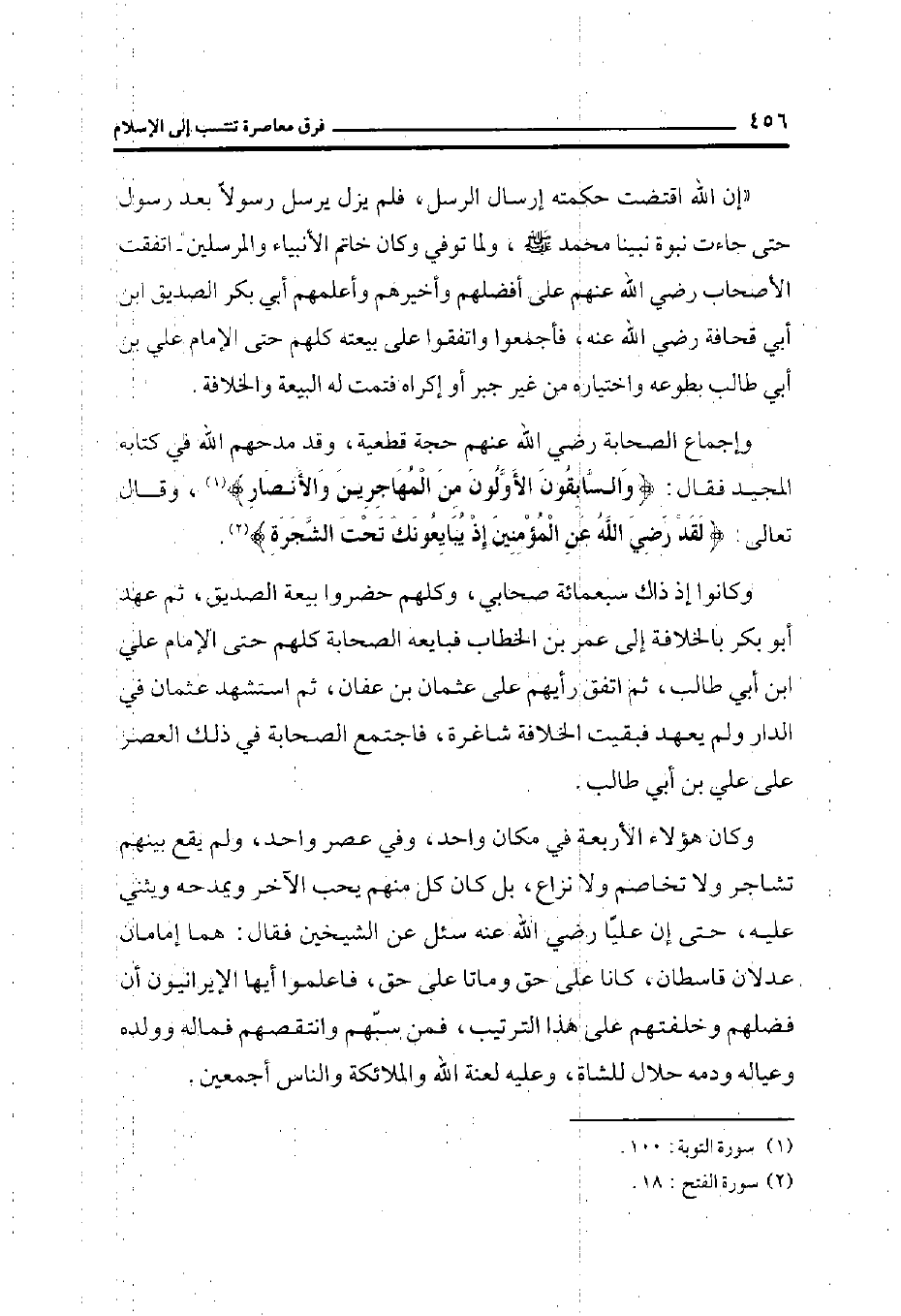 وكان هؤلاء الأربعة في مكان واحد، وفي عصر واحد، ولم يقع بينهم تشاجر ولا تخاصم ولا نزاع، بل كان كل منهم يحب الآخر ويمدحه ويثني عليه، حتى إن علياً رضي الله عنه سئل عن الشيخين فقال: هما إمامان عدلان قاسطان، كانا على حق وماتا على حق، فاعلموا أيها الإيرانيون أن فضلهم وخلفتهم على هذا الترتيب، فمن سبّهم وانتقصهم فماله وولده وعياله ودمه حلال للشاة، وعليه لعنة الله والملائكة والناس أجمعين.