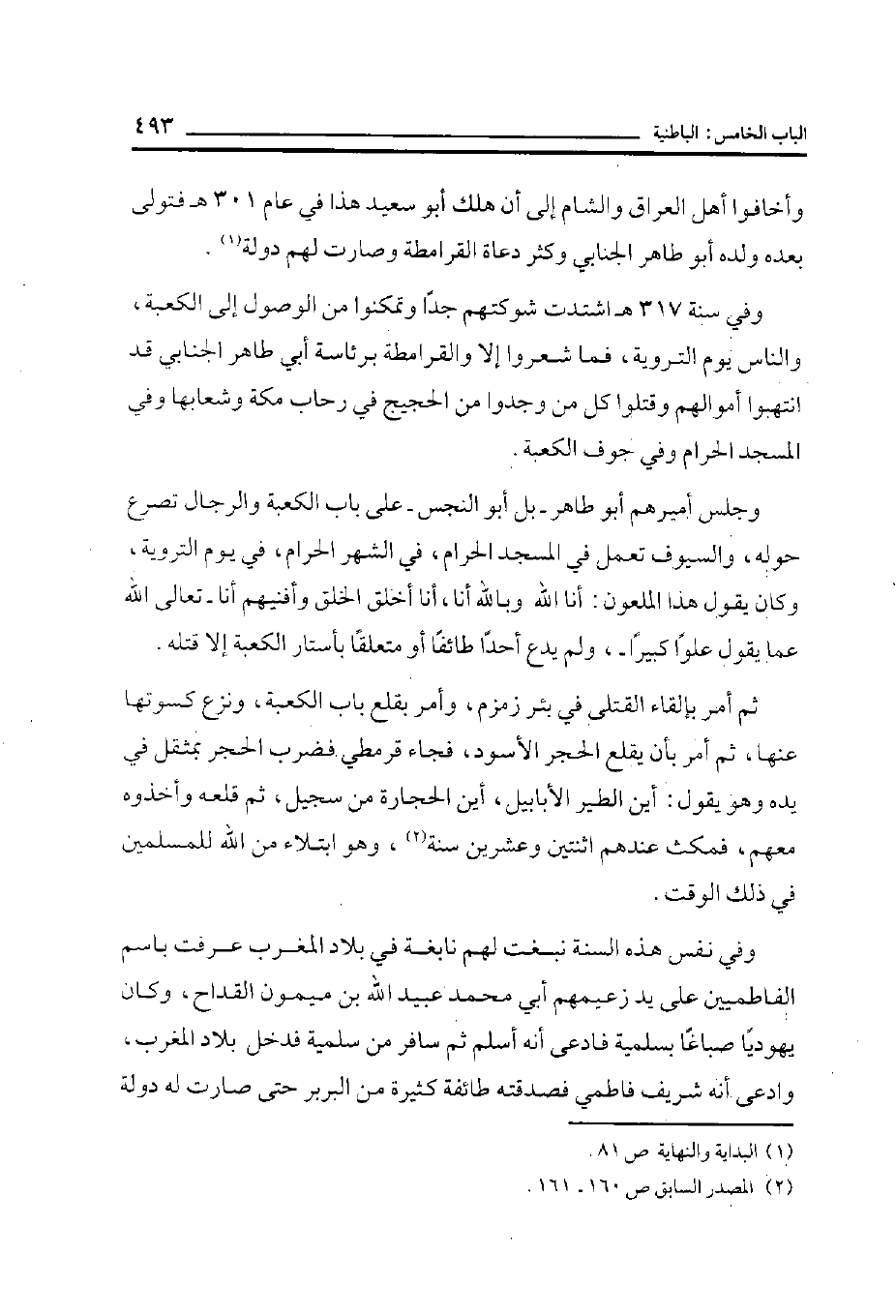 وجلس أميرهم أبو طاهر -بل أبو النجس- على باب الكعبة والرجال تصرع حوله، والسيوف تعمل في المسجد الحرام، في الشهر الحرام، في يوم التروية، وكان يقول هذا الملعون: أنا الله وبالله أنا، أنا أخلق الخلق وأفنيهم أنا -تعالى الله عما يقول علواً كبيراً-، ولم يدع أحداً طائفاً أو متعلقاً بأستار الكعبة إلا قتله.