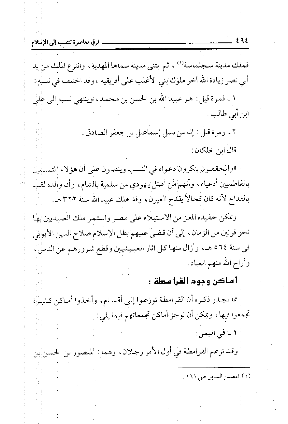((والمحققون ينكرون دعواه في النسب وينصون على أن هؤلاء المتسمين بالفاطميين أدعياء، وأنهم من أصل يهودي من سلمية بالشام، وأن والده لقب بالقداح لأنه كان كحالاً يقدح العيون، وقد هلك عبيد الله سنة 322هـ.