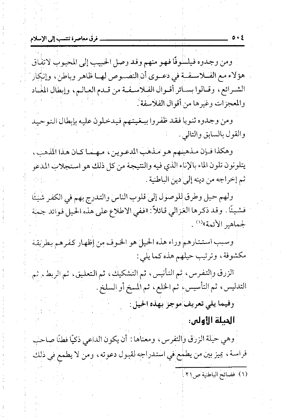 ولهم حيل وطرق للوصول إلى قلوب الناس والتدرج بهم في الكفر شيئاً فشيئاً. وقد ذكرها الغزالي قائلا: ((ففي الاطلاع على هذه الحيل فوائد جمة لجماهير الأئمة)) (¬1) .