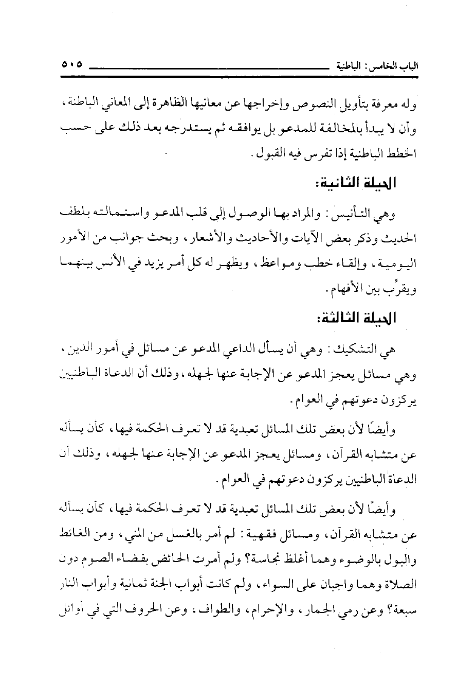 وأيضاً لأن بعض تلك المسائل تعبدية قد لا تعرف الحكمة فيها، كأن يسأله عن متشابه القرآن، ومسائل يعجز المدعو عن الإجابة عنها لجهله، وذلك أن الدعاة الباطنيين يركزون دعوتهم في العوام.